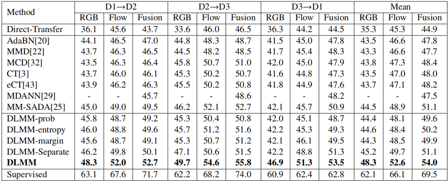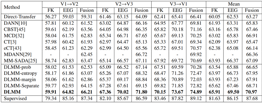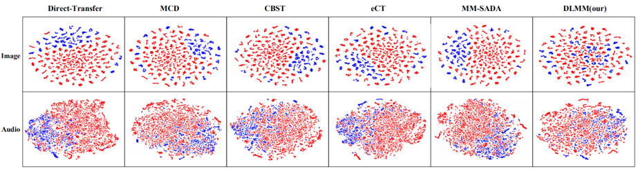 本文提出的方法DLMM在三个多模态跨域数据集上与现有的多模态域适应方法和单模态域适应方法的比较如表2、表3和表4所示,本文方法相较于其他先进方法取得了更好的跨域效果。图3展现了AVE数据集上的特征可视化效果,可以看到相比于其他方法,本文方法DLMM能够更好地减少源域和目标域的域漂移。