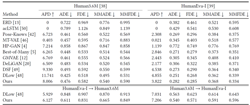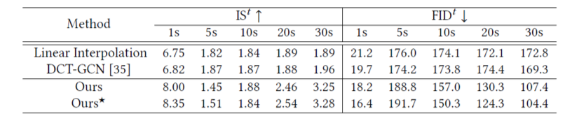 如表1和表2所示,我们在人体运动序列预测和运动序列补全两个任务上进行了实验评估。表1中显示了我们的方法在序列预测任务上达到了与当前效果最好工作相当的性能,在跨场景迁移的设定下,我们方法具有更强的泛化效果。表2中的结果显示我们方法在运动序列补全任务上的效果也要优于基线模型。