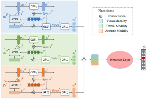 具体来说,我们为每个模态维护一个并行传播分支,其中子网络的结构相同,并且相应子模块的参数共享。每个子网络包含三个门控循环单元 (GRU),分别用于捕获上下文关系、说话者状态和情感动态(如图2所示)。在此基础上,应用了一种自适应策略确定哪些子模块(即GRU)在哪些模态中被保留或丢弃。另外我们制定了两个额外的损失函数来捕捉这种平衡。所有子模块的学习策略不仅可以视为模态级别的决策,还可以视为上下文级别的决策。即,每个学习到的策略值不仅决定在某个对话轮次中保留或丢弃不同模态的哪些信息,而且还决定何时在某模态的对话流中传播或遗忘哪些信息。因此,MetaDrop能够通过学习丢弃什么和何时丢弃来同时模拟多模态和上下文动态。在两个主流的多模态数据集IEMOCAP和MELD上进行的实验表明,MetaDrop的表现优于以前的方法。