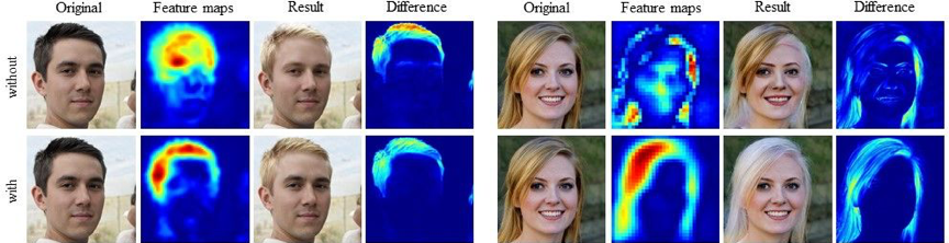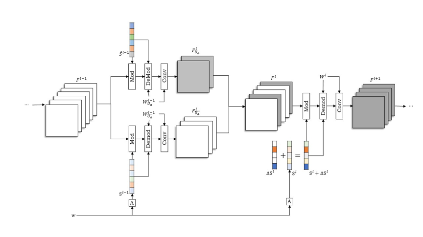 但是,仅依靠这些稀疏的方向向量实现的语义编辑效果面临目标区域变化不足和无关区域耦合严重的问题。如图3所示,无论是变化不足还是耦合问题,图片编辑前后的差别图和被修改调制参数通道对应的特征图的空间分布十分相似。深入分析StyleGAN2的合成机制后,我们认为同之前的文章类似地只修改调制参数不足以实现精确的局部属性编辑,而应当协同操纵调制参数及其对应的特征图。我们把这些对应于不同局部属性编辑任务的调制参数及其调制的特征图合称为控制单元。