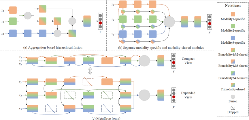 本工作寻求探索一种能以较小的成本有效适应多感官数据类型增加,同时实现充分的多模态信息交互的机制。我们提出了MetaDrop,在该框架中,模型可以自行学习以决定哪些模态里的哪些子模块由于干扰而丢弃,保留作为模态特定信息,或在跨模态中共享,且无需手动组合。如图1(c)所示,MetaDrop为每个模态中的每个子模块学习一个保留或丢弃的二元决策,自适应地选择执行或跳过哪些子模块,即决定哪些子模块被丢弃、被融合共享或被作为模态特定信息。由于学习到的策略值是离散且不可微的,我们使用了Gumbel-Softmax用于可微近似,因此可以通过标准反向传播对网络进行端到端训练。