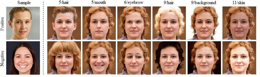 如图2所示,选择两个正负样本,计算这两个样本对应的调制参数之差,然后保留不同层的不同区域相关的调制参数之差,可以构造多个稀疏的语义编辑向量。沿着这些语义编辑向量移动调制参数,可以实现多种语义编辑效果。