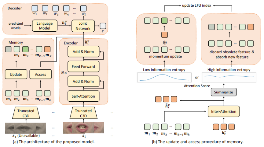 我们研究了实时唇语识别的任务,并从三个方面设计了具有注意力引导自适应记忆的唇语识别器SimulLR:(1)为了解决同时设置下生成的句子单调对齐的问题,同时考虑其句法结构,我们建立了一个基于传感器的模型,并设计了有效的训练策略,包括CTC预训练、模型预热和课程学习,来促进唇读传感器的训练。(2)为了更好地学习同步编码器的时空表示,我们构造了一个截断的3D卷积和限时的自注意力层,在固定帧数的视频片段中进行帧与帧的交互。(3)在实时场景下,特别是在海量视频数据的情况下,历史信息往往会被大量存储。因此,我们设计了一种新的注意引导自适应记忆方法来组织历史片段的语义信息,并在可接受的计算延迟的情况下增强视觉表示。