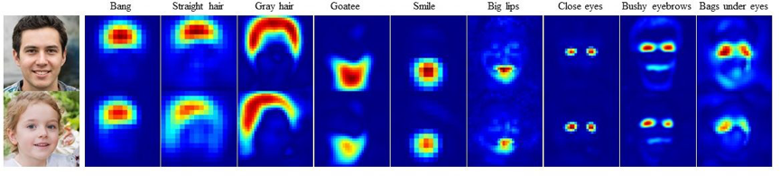 StyleGAN2中的中间特征图具有明显的局部激活特性。如图1所示,对应于不同生成图片的中间特征图在相同的人脸语义区域持续激活。基于此,我们设计了一种基于梯度反向传播的特征图高激活区域判定方法,能够简单有效地定量衡量特征图及其对应的调制参数的区域相关性。根据每个通道不同的区域激活特性,能将生成器中间特征和调制参数的不同通道划分为多组。