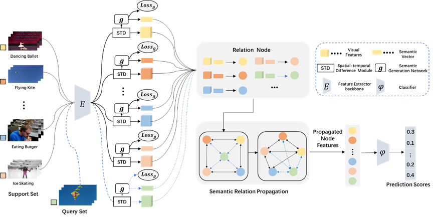 图1展示的是语义引导的关系传播网络示意图。首先,研究者发现当训练样本较少时,仅仅利用视频中的视觉特征是不能够得到较好的分类。然而样本中不仅包含视频信息,还包含语义信息。为了能够让视觉特征更加具有判别力,该研究同时利用样本中的视觉信息和语义信息,使得视觉特征更加具有判别力。同时,单纯的依赖语义信息去增加视觉特征的判别力是不够的,该研究又提出了时空差异性模块来提升对视频的视觉特征学习能力。该模型的优势在于能够利用跨模态信息为视频描述提供指导,从而增强视觉特征的判别力;同时,时空差异性模块也提升了网络对视频特征的学习能力。时空差异性模块是一个即插即用的模块,便于在其他领域进行模块内容的扩展。