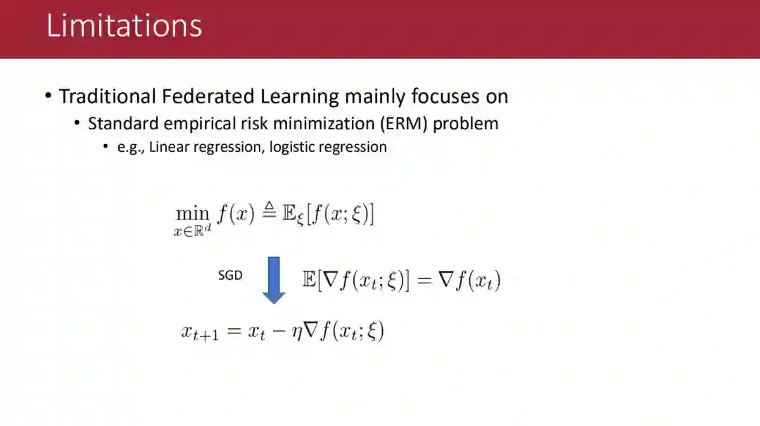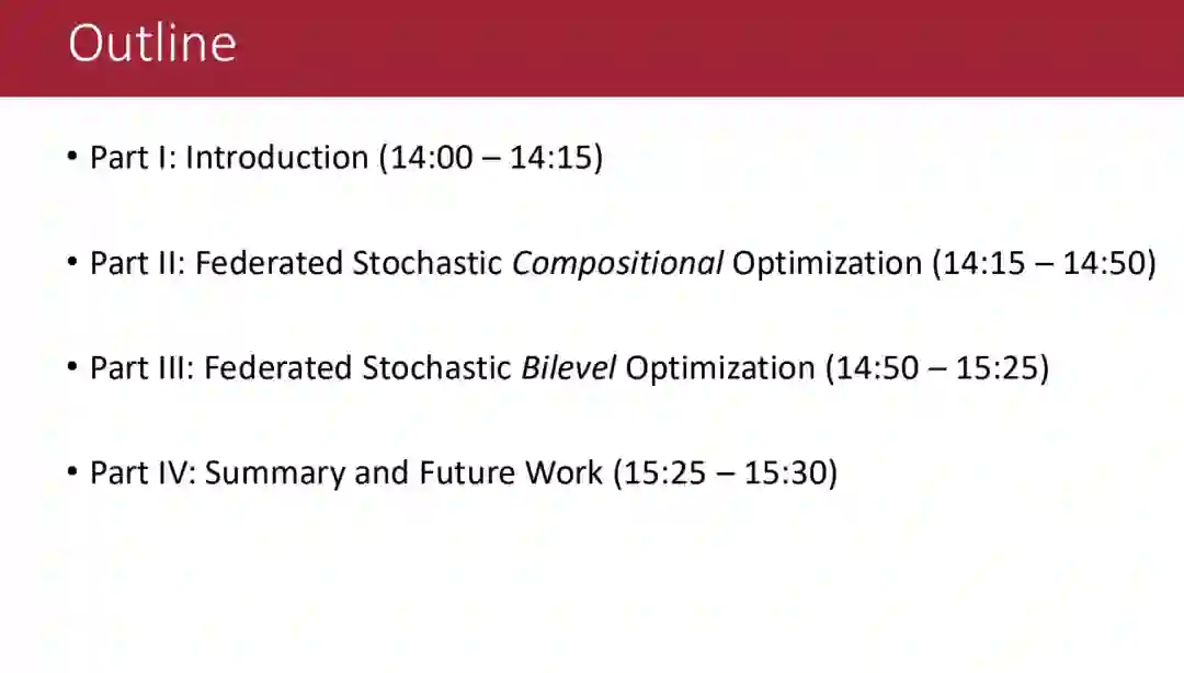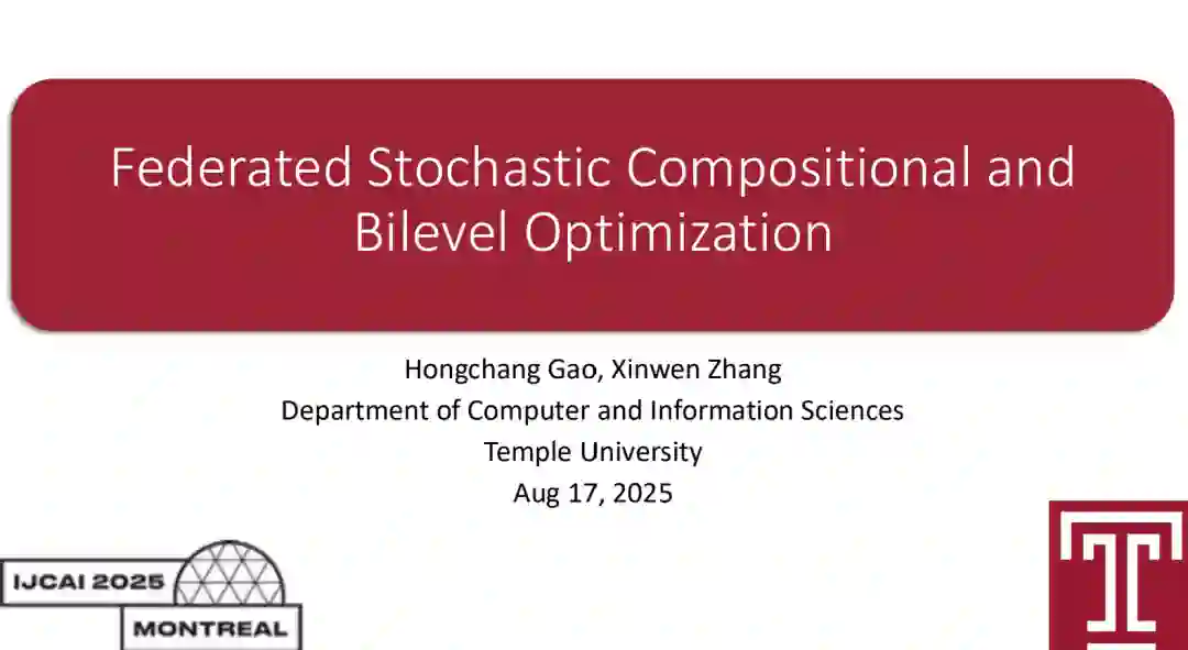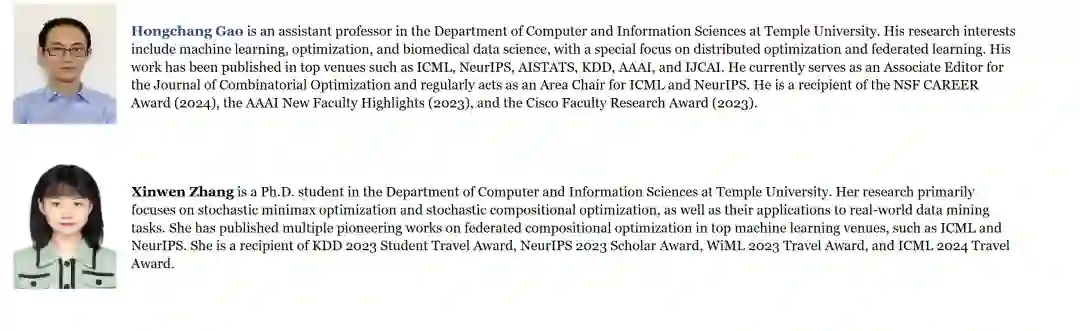 联邦学习近年来受到广泛关注,催生了大量方法。然而,大多数方法仅关注传统的最小化问题,未能解决机器学习中新兴的学习范式。因此,本教程聚焦于可以表述为随机组合优化(SCO)问题和随机双层优化(SBO)问题的学习范式,因为它们涵盖了传统最小化问题之外的各种机器学习模型,如模型无关元学习、不平衡数据分类模型、对比自监督学习模型、图神经网络、神经架构搜索等。组合结构和双层结构为联邦学习带来了独特的计算和通信挑战。为了应对这些挑战,近年来开发了一系列联邦组合优化和联邦双层优化方法。然而,这些进展并未得到广泛传播。因此,本教程旨在介绍联邦SCO和SBO的独特挑战、最新进展以及实际应用。观众将通过本教程深入了解联邦SCO和SBO算法,并学习如何将其应用于实际应用中。 https://hcgao.github.io/tutorial_ijcai2025.html