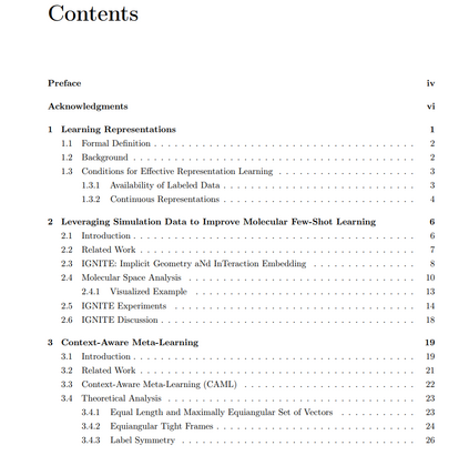 受限条件下的表示学习很少有学科能像机器学习这样在过去十年中经历如此快速的发展。即使在过去的几年中,研究领域也在不断演变,并重新聚焦于新的挑战,这些挑战往往由改变社会、影响人类思维、生活和工作的潜力所驱动。支撑这些进步的核心组件是表示学习:一种将输入转换为新表示的技术,以捕捉数据中的结构和模式。本论文并不专注于改进典型学习范式中的表示学习,而是探索其在某些情况下表现不佳的实例。我们的重点是在受限条件下学习表示,并朝着在表示学习表现不稳定、性能较差或“效果不佳”的环境中解锁表示学习迈出一步。第一章从表示学习的概述开始。它提供了正式的定义,探讨了早期表示学习算法的历史,并概述了这些方法通常需要满足的两个条件。然后,我们研究了打破这些条件会如何干扰表示学习,并列举了这些限制在现实世界中的几种表现场景。第二章,我们聚焦于数据稀缺的限制,并以分子科学中的一个应用为动机展开研究。我们探索利用基于物理的分子模拟数据(借助数十年的技术进步)来学习捕捉基本蛋白质-配体结合模式的表示。对于我们的目标任务——预测小分子是否激活或抑制特定蛋白质,我们发现使用基于模拟数据训练的表示作为起点,可以显著提高建模性能。第三章继续关注数据稀缺问题,但从不同的角度解决这一问题。我们开发了一种元学习算法,该算法能够使用极少量的标注样本学习如何将输入转换为新任务的表示。与之前需要在标注样本上进行微调的工作不同,我们的方法在推理过程中不更新模型参数,并且在许多少样本学习基准测试中达到了新的最先进水平。第四章,我们转向学习离散表示的限制。这一范式具有挑战性,因为离散化在通常用于学习表示的光滑目标函数中引入了不可微分的点。我们专注于一种流行的离散化形式——向量量化,并改变了梯度通过这一操作的方式。在11种使用向量量化的不同范式中,我们的梯度估计器提高了性能并减少了训练不稳定性。第五章总结了本论文的贡献,并提出了未来工作的可能方向。