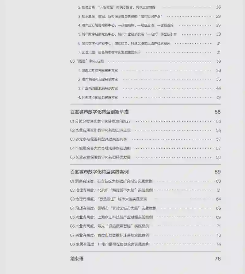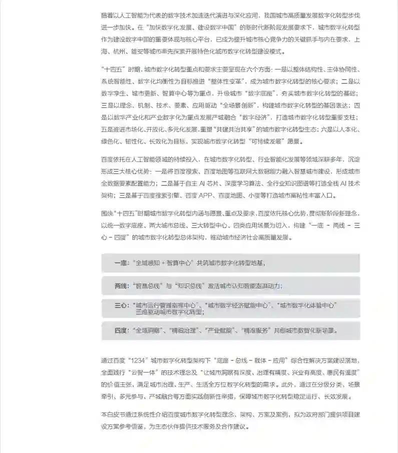 百度智能云智慧城市发布《百度城市数字化转型白皮书》《白皮书》显示,新时期城市数字化转型的重点包含六个方面:应加快“数字底座”升级,以“整体性变革”和“可持续发展”为目标导向,以理念、机制、技术、要素、应用的“全场景创新”,驱动数字经济、数字政府和数字社会的高质量发展,打造“共建共治共享”的城市数字化转型生态。
