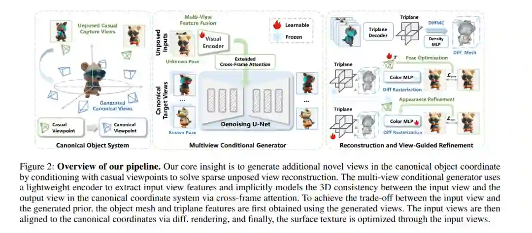 从稀疏且无姿态的观测中推断3D结构是一个具有挑战性的任务,因为其本质上是不受约束的。近年来,一些方法提出直接从无姿态的输入中以数据驱动的方式预测隐式表示,取得了令人鼓舞的结果。然而,这些方法未能利用几何先验,也无法推测未见区域的外观,因此在重建精细的几何和纹理细节时面临困难。为了解决这一挑战,我们的核心思想是将这个病态问题重新表述为条件新视图合成,旨在通过有限的输入视图生成完整的观测,以促进重建过程。在生成完整观测后,可以轻松恢复输入视图的姿态,并进一步优化重建的对象。 为此,我们提出了一种新颖的管线——Pragmatist。首先,我们通过一个多视图条件扩散模型生成对象的完整观测。然后,我们利用一个前馈式的大型重建模型获得重建的网格。为了进一步提高重建质量,我们通过反演得到的3D表示恢复输入视图的姿态,并利用细节丰富的输入视图进一步优化纹理。与以往方法不同,我们的管线通过高效利用无姿态输入和生成先验,绕开了直接求解高度病态问题的困难。大量实验证明,我们的方法在多个基准上实现了令人满意的性能表现。 https://www.zhuanzhi.ai/paper/1a3a5e6819188894542bfbf467335b13