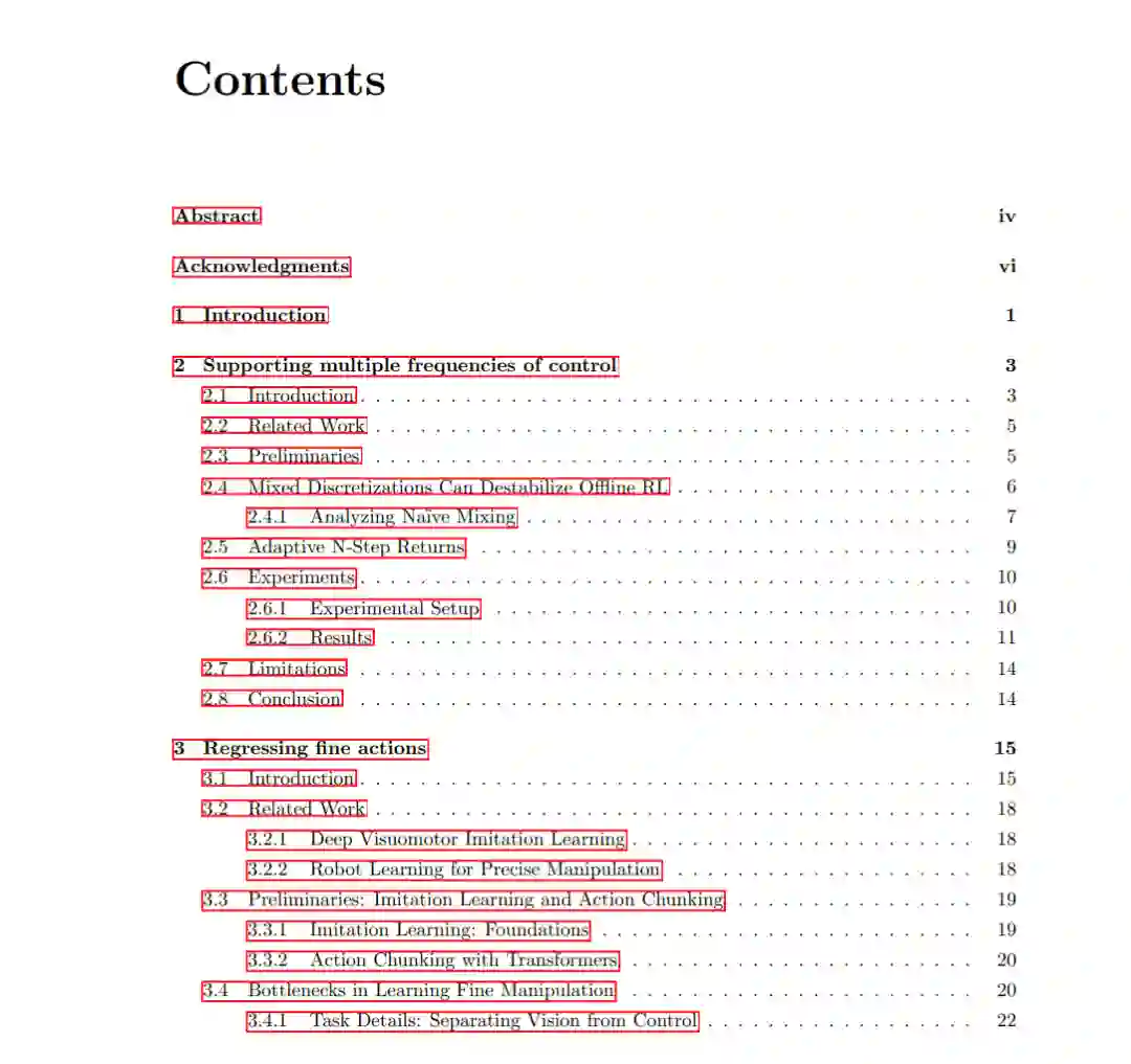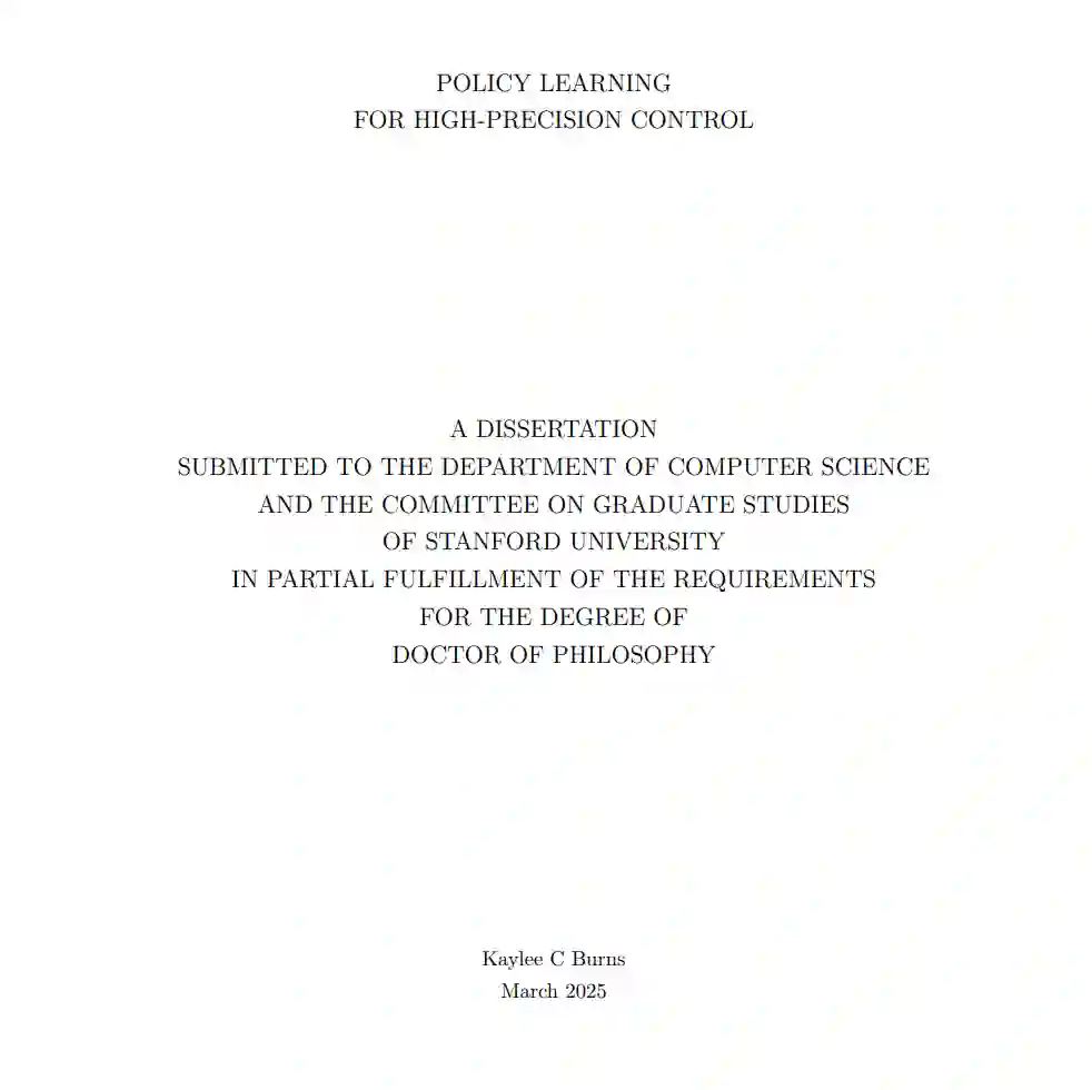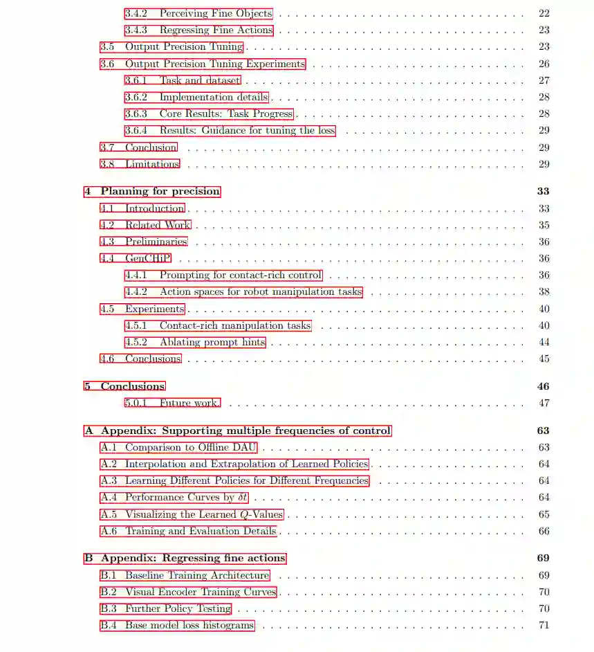 本论文致力于通过现代策略学习方法突破高精度操控任务的极限,系统性地解决了当前策略学习框架在全控制栈中的不足。我们首先揭示了高频控制对精确策略的关键作用:当任务容差阈值极小时,策略查询频率不足将导致响应能力缺失。针对离线强化学习(RL)原生不支持混合频率数据的局限,我们发现不同离散化频率会导致Q值传播速率差异,进而提出通过Q-step回报的离散化规模缩放来实现Q值更新速率一致性的创新方法。在三个机器人控制仿真任务中,该方法成功实现了跨频率泛化能力。 在模仿学习方面,我们通过仿真实验解耦物体几何属性与视觉特征,首次证实精确控制(而非视觉感知)是精细操作任务的主要瓶颈。针对典型模仿学习流程的系统分析揭示了三大障碍:(i) 传统损失函数在不同误差区间的非线性行为;(ii) 批次不足导致的梯度噪声超过任务精度要求;(iii) 收敛所需梯度步数过多。由此提出的"输出精度调优"方案整合了分段L1损失函数、梯度累积虚拟批次和输出层过训练三项技术,在六项真实世界精细操作任务中平均提升75%的性能表现。 针对基于大语言模型(LLM)的规划器,我们创新性地设计了兼容接触力约束的动作空间参数化方法。实验表明,通过融合目标位姿的交互刚度约束估计,LLM策略生成成功率较非兼容动作空间提升3-4倍,成功拓展了代码生成方法在接触密集型高精度任务中的应用边界。这项研究为突破感知噪声和抓取误差等现实条件限制下的精确控制提供了新范式。