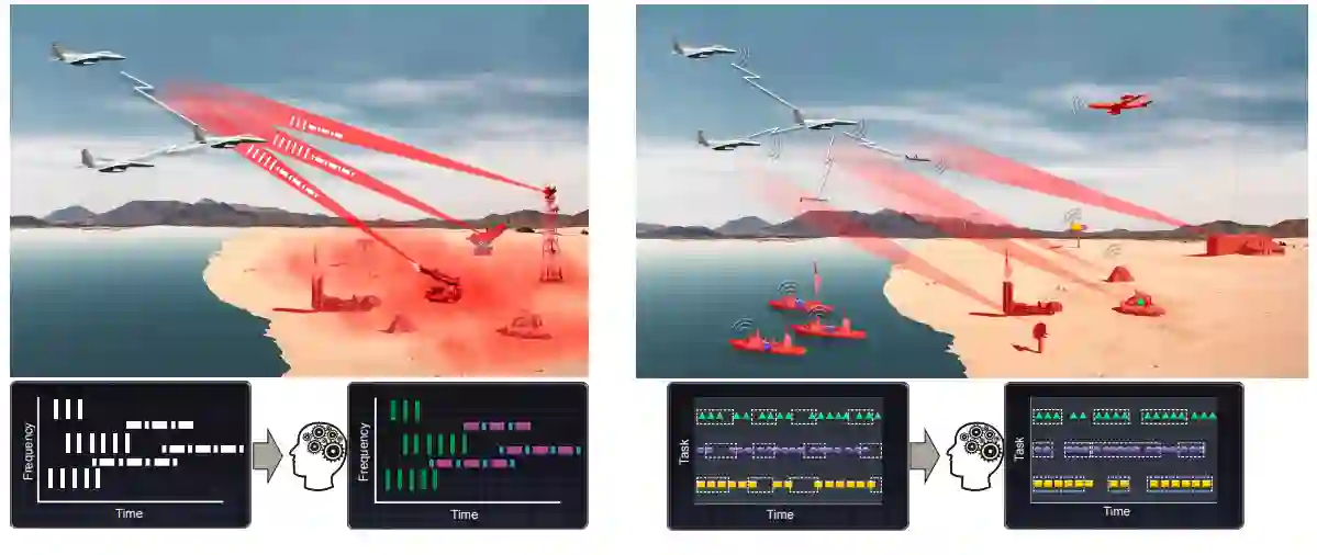 图1. 在APL的PSMA中,有两个感兴趣的协作EW主题。美国将建立频谱优势,并通过使用协作式EW来对对手提供压倒性的EW效果。为了实现这一目标,必须克服两个挑战:分布式传感,ML AMR将识别感兴趣的特定信号(左);以及分布式资源管理,传感和干扰资源将在战斗空间中自动管理(右)。