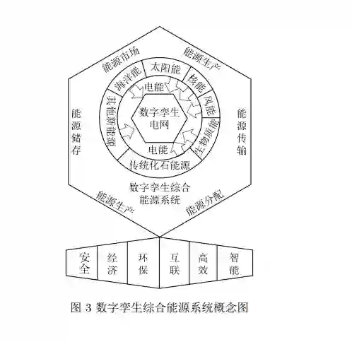 传统电网往往由于设备复杂、管理水平低下等导致其运行效率低、能耗高[59],随着以新能源为主体的新型电力系统不断发展,传统电网要抓住新能源技术和数字化技术,加速向综合能源系统演进。未来的综合能源系统将以电能和电网为核心,因此,数字孪生综合能源系统将以数字孪生电网为核心,具备环保、安全、互联、智能、高效、经济等特征,从能源生产到消费贯穿能源行业的方方面面[58],其概念如图3所示。