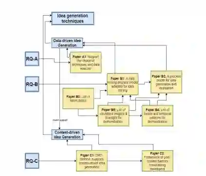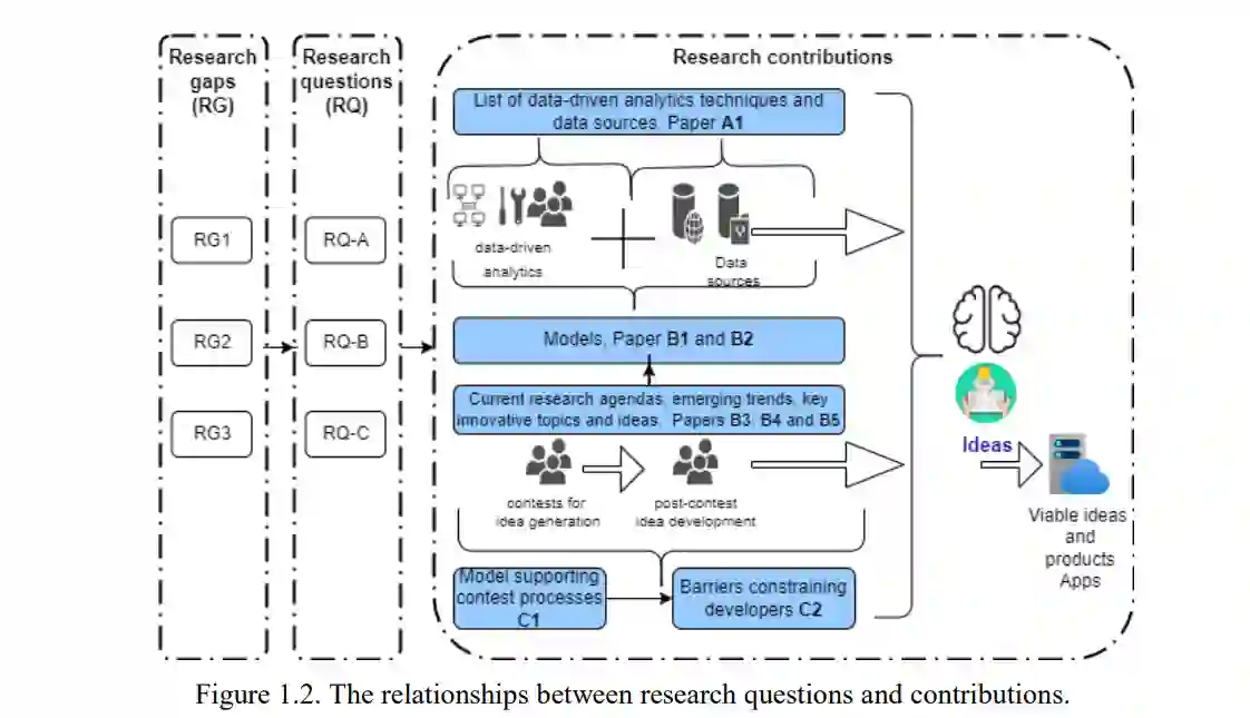 本节介绍了本论文中涉及的研究差距(RG)。研究差距分为三大类,以简化本论文的阐述和逻辑连贯性:1)缺乏有组织的数据源和数据驱动的分析技术来支持创意的产生;2)缺乏支持机器学习驱动的创意产生的过程模型;3)缺乏支持竞赛的过程模型和框架来应对创意产生的竞赛后障碍。