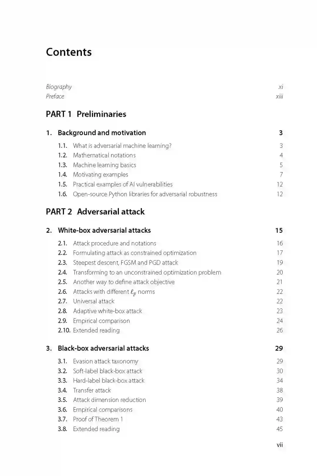 我们将本书各部分的内容总结如下。在第1部分中,我们介绍了本书的初步内容,将对抗性鲁棒性与对抗性机器学习联系起来,并提供了有趣的发现来激励对抗性鲁棒性。在第2部分中,我们介绍了不同类型的对抗攻击,对攻击者在机器学习生命周期、目标机器学习系统知识、数字和物理空间的实现以及数据模态中的能力进行了不同的假设。在第3部分中,我们介绍了量化神经网络可证明鲁棒性水平的认证技术。在第4部分中,我们将介绍用于提高机器学习对对抗性攻击的鲁棒性的防御。最后,在第5部分中,我们介绍了几个从机器学习的对抗鲁棒性研究中获得灵感的新应用。