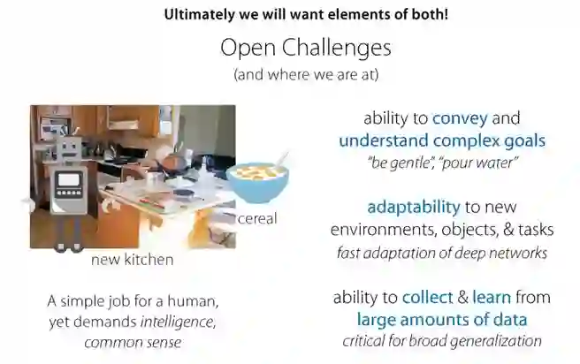 机器人学习的一些挑战:理解和转化一些复杂的命令;新环境的适应性;收集大量数据并从中学习。