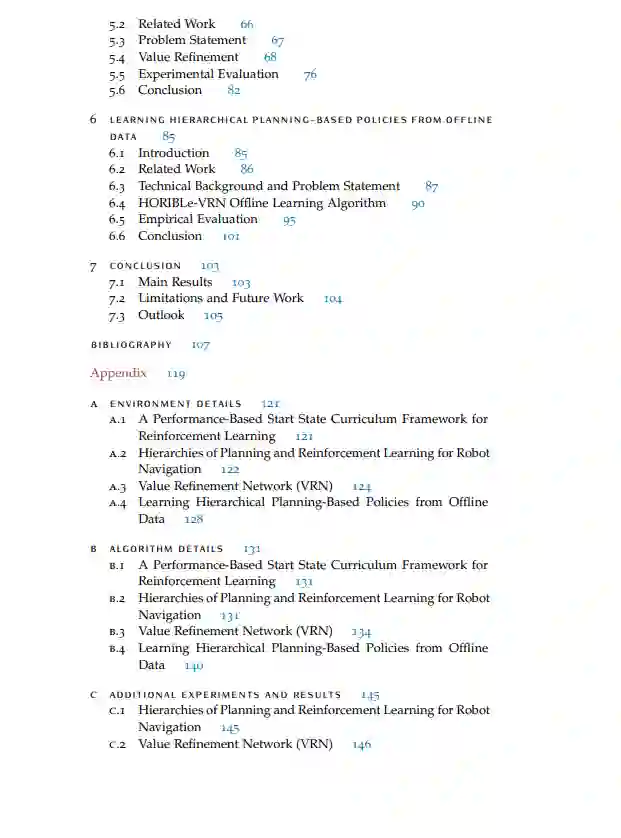 最后,我们通过提出HORIBLe-VRN算法来处理离线学习设置,以从预先收集的数据中学习上述基于层次规划的策略。它结合了层次模仿学习,包括潜在子目标的推断,以及随后对VRN的离线RL细化。我们的实证评估显示出良好的性能、泛化能力以及对次优演示的一定鲁棒性。 总结来说,我们提出了基于RL和规划技术的算法,这些算法使得在稀疏奖励智能体导航任务中的学习和数据效率得到了提高。