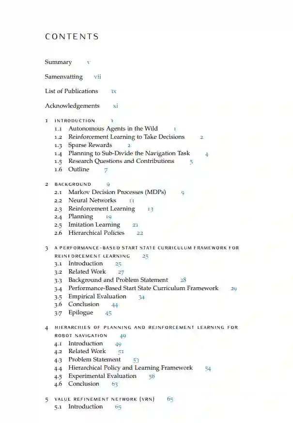 强化学习(RL)是一种机器学习范式,用于通过与环境的互动来学习决策策略,该策略通常由神经网络表示。如果智能体执行环境中的动作所接收的奖励是稀疏的,那么改进策略变得困难且低效。因此,在这篇论文中,我们专注于在这种稀疏奖励设置下,提高自主智能体的策略学习;特别是探讨了结合RL和规划的优势。 首先,我们研究了自动生成一个将最初无技能的智能体置于逐渐增加难度的起始状态的课程。我们提出了一个基于性能的起始状态课程框架,以及一个选择在智能体能力的空间边界开始的新颖空间梯度(SG)策略。 之后,我们通过假设有一张粗略的地图并且额外地目标是跨环境泛化,稍微调整了设置。我们提出了一个层次化策略架构,VI-RL,它将在问题抽象中以较低的时间分辨率规划子目标与学习达到这些子目标的策略相结合。这通过将决策问题划分为更短的子任务来简化决策问题。我们展示了从可用的轮次数据中学习适合规划的转移模型的能力,该模型捕捉了智能体的能力并实现了泛化。