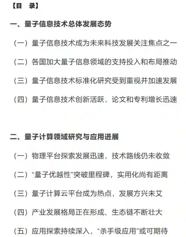 摘要: 近年来,以量子计算、量子通信和量子测量为代表的量子信息技术的研究与应用在全球范围内加速发展,各国纷纷加大投入力度和拓宽项目布局。三大领域的技术创新活跃,专利与论文增长较为迅速,重要研究成果和舆论热点层出不穷。我国量子信息技术研究和应用探索具备良好的实践基础,加大支持力度,突破瓶颈障碍,聚力加快发展,有望实现与国际先进水平并跑领跑。 为推动我国量子信息技术应用探索和产业化健康发展,中国信息通信研究院在2018年发布研究报告基础上,组织编写了《量子信息技术发展与应用研究报告》(2019年),深入分析量子信息技术三大领域的关键技术、热点问题、发展现状、演进趋势,阐述我国面临的机遇与挑战,以及未来发展态势。