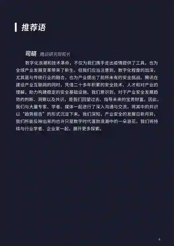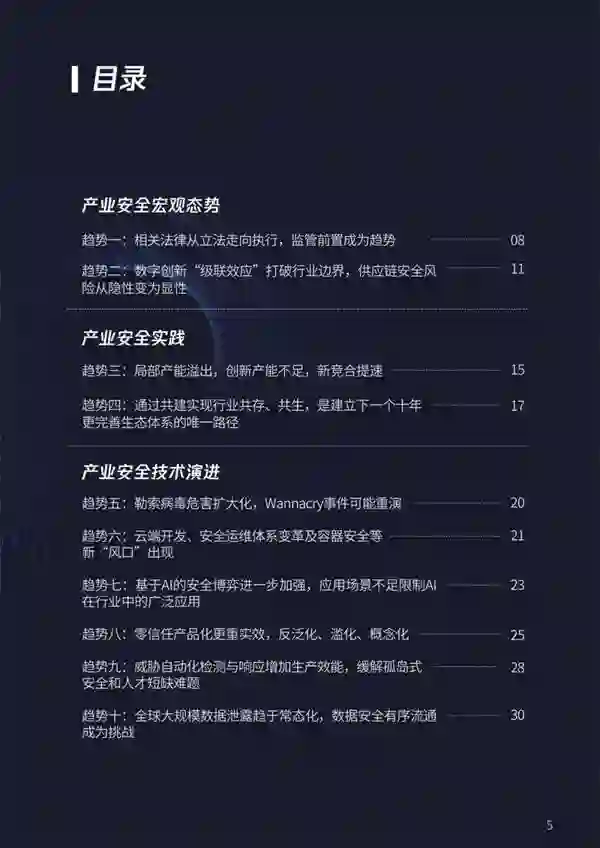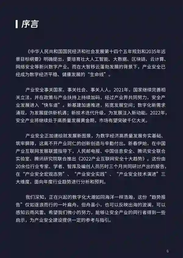 但无论是从行业、企业,还是在国家战略部署的维度看,资本是否密集只是一个阶段性的指标,它并不代表行业本身的先进性。相对而言,一些具有长效价值、需要逐步打磨、投入相对更多人力和资源的技术方向,仍缺乏资本的关注和助力。 根据行业发展的过往经验研判,**《趋势》认为,安全产业将继续保持高度竞争的态势,呈现出超过数字经济整体发展速度的趋势。**企业与企业之间的竞争格局将会持续变化。当前的行业领导者,将会面对掌握技术核心竞争力的新兴企业的挑战。而大企业在人才、资本、客户积累上保有优势,市场格局将会发生剧烈变化。 当前数字经济正处于创新周期,各种新应用、新模式、新技术不断出现,同时也在与工业、农业、金融、传媒等传统行业相互交融,衍生出更多的机遇与挑战。安全产业本身是一个迭代极其快速的行业,“共建模式”是建立下一个十年更完善生态体系的唯一路径,新的应用、操作系统和新的开源思路持续更新,使产业永远处于共建的进程当中。 2022产业互联网安全十大趋势