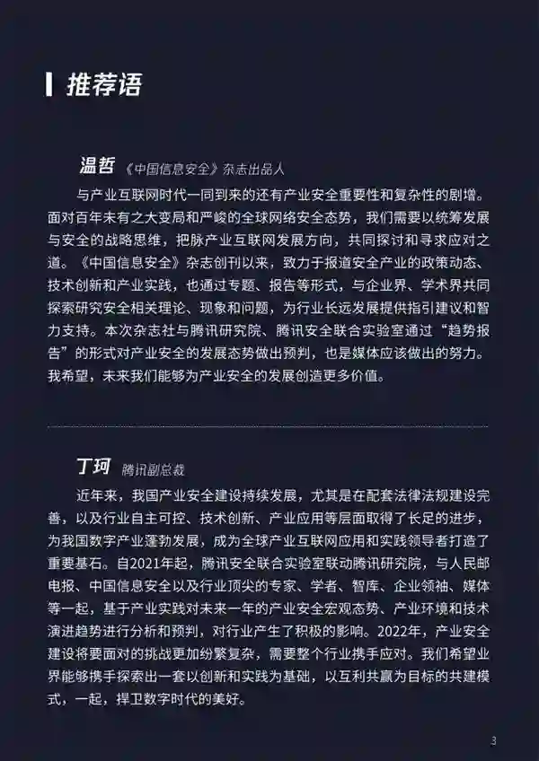 近年来,勒索软件攻击愈演愈烈,仅2021年上半年,就至少发生了1200多起勒索软件攻击事件,极大地威胁数字经济的平稳健康发展。Cybersecurity Ventures的调查数据显示,2021年全球勒索软件造成的损失将达到200亿美元,预估到2031年,损失将超过2650亿美元。 日前,在中国产业互联网发展联盟指导下,人民邮电报、中国信息安全、腾讯安全联合实验室、腾讯研究院联合推出《2022产业互联网安全十大趋势》(以下简称《趋势》)。报告围绕“产业安全宏观态势”“产业安全实践”“产业安全技术演进”三大维度,面向年度行业趋势进行分析和研判,为产业数字化发展提供参考和指引。 技术演进的背后,“风口”与“风险”相倚伴生