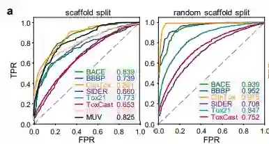 基准评估 作者首先使用8种药物发现的基准数据集来评估ImageMol的性能,并且使用两种最流行的拆分策略(scaffold split与random scaffold split)来评估 ImageMol 在所有基准数据集上的性能。在分类任务中,利用受试者工作特征(receiver operating characteristic, ROC)曲线下面积AUC值来评估,从实验结果可以看出,ImageMol均能得到较高的AUC值 (图a) 。