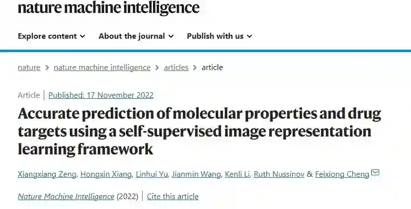 近日,湖南大学DrugAI实验室在Nature子刊《Nature Machine Intelligence》上发表名为”Accurate prediction of molecular properties and drug targets using a self-supervised image representation learning framework”的研究论文,提出了一种全新的分子表征框架——基于分子图像的自监督深度学习框架ImageMol。它通过在1000万个未标记的类药生物活性分子上进行预训练,实现了对分子性质和药物靶标的准确预测,开创了分子表征学习的新范式。