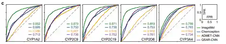 ImageMol与最先进的卷积神经网络(CNN)框架Chemception在HIV和Tox21的检测结果对比 (图b) ,ImageMol的AUC值更高。并且在进行ImageMol模型与Chemception、ADMET-CNN和QSAR-CNN三种先进模型在CYP1A2, CYP2C9 , CYP2C19, CYP2D6 和 CYP3A4 的对比中 (图c) ,ImageMol的AUC值均处于最高值。