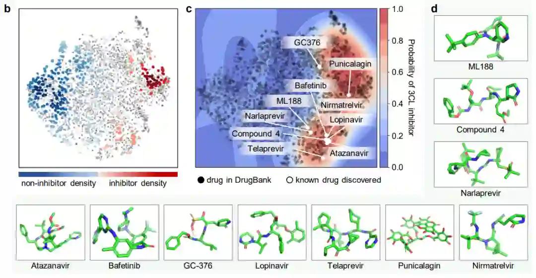 识别抗SARS-CoV-2抑制剂 对药物分子研究关乎最直接的实验来了,利用ImageMol直接识别病毒抑制剂分子!通过ImageMol框架下3CL蛋白酶(已被证实是治疗COVID-19的有希望的治疗发展靶点)抑制剂与非抑制剂数据集的分子图像表示,我们发现3CL抑制剂和非抑制剂在t-SNE图中很好地分离,如下图 (b) 。