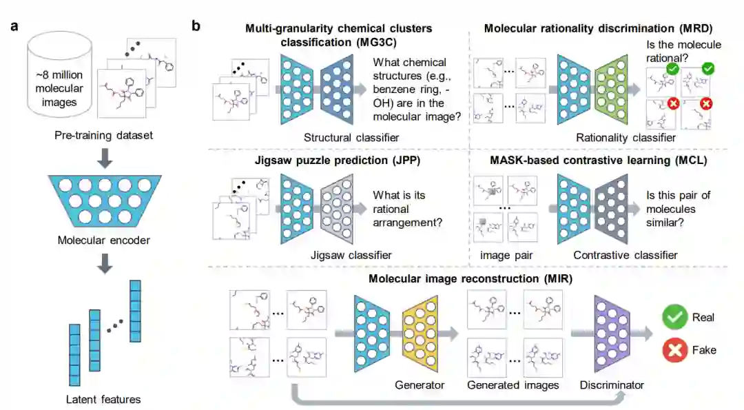 (1) 分子编码器molecular encoder**(浅蓝色)能够**从约1000万张分子图像中提取潜在特征 (a) 。 (2)五个预训练策略(MG3C、MRD、JPP、MCL、MIR)利用分子图像中的化学知识和结构信息来优化分子编码器的潜在表示 (b) 。五种预训练策略为: ① MG3C(Muti-granularity chemical clusters classification 多粒度化学簇分类):其中的结构分类器Structure classifier(深蓝色)用于预测分子图像中的化学结构信息; ② MRD(Molecular rationality discrimination 分子合理性鉴别器):其中的合理性分类器Rationality classifier(绿色)用于区分合理和不合理分子; ③ JPP(Jigsaw puzzle predicition 拼图预测):其中的拼图分类器Jigsaw classifier(浅灰色)用于预测分子的合理排列; ④ MCL(MASK-based contrastive learning 基于MASK的对比学习):其中的对比分类器Contrastive classifier(深灰色)用于最大化原始图像和mask图像之间的相似性; ⑤ MIR(Molecular image reconstruction 分子图像重建):其中的生成器Generator(黄色):用于将潜在特征恢复为分子图像,鉴别器Discriminator(紫色)用于区分真实图像和生成器生成的假的分子图像。 (3)对预训练的分子编码器在下游任务中微调,以进一步提高模型性能 (c) 。