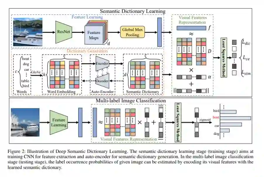 该工作旨在解决多标签图像分类任务,文章另辟蹊径,首次将多标签图像分类问题视为字典学习任务,基于此设计了一个新型的端到端深度语义字典学习模型(Deep Semantic Dictionary Learning,图1),该模型能够更好地从标签与语义空间中挖掘益于样本多标签分类的判别信息。此外,受传统字典学习的迭代式优化的启发,文章中提出了一种适用于深度字典学习模型的交替式优化策略(Alternately Parameters Update Strategy,图2)。实验结果验证了该文章中提出的算法在多标签图像分类任务上取得了振奋人心的结果。