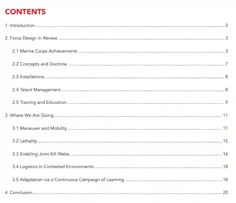 本次更新说明了在兵力设计方面的现状以及未来的方向。强调了在编成、能力和概念方面取得的进展,同时承认现代化是一个持续完善的过程。兵力设计仍是海军陆战队的战略优先事项,须继续加速推进。