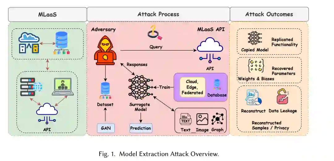 机器学习即服务(Machine-Learning-as-a-Service, MLaaS)的兴起极大地改善了人工智能技术的可获得性,它降低了传统上与采用和部署复杂机器学习模型相关的门槛 [237]。在早期,部署机器学习需要在计算基础设施、大规模数据存储以及开发、训练和维护模型所需的专业知识方面进行大量投资。这些要求本质上将先进 AI 能力的采用限制在资源充足的组织范围内。MLaaS 平台通过用户友好的标准化 API 抽象化了模型开发与部署的复杂性,从而解决了这一问题。因此,无论组织规模大小或技术水平高低,开发者和企业都可以将复杂的 AI 模型集成到应用中,而无需直接参与模型训练、硬件配置或可扩展性管理。这种易用性促进了在医疗 [88, 101]、金融 [3, 88, 171] 等多个领域的广泛应用,有效推动了 AI 的民主化,使得资源有限、技术储备不足的实体也能受益。 然而,MLaaS 的公开接口虽然对其集成至关重要,但也无意中引入了新的安全漏洞 [158, 201]。具体而言,对手可以利用 MLaaS 所依赖的查询-响应机制,系统性地探测并推断模型的关键信息,包括架构、参数和决策边界。这类模型提取攻击(Model Extraction Attacks, MEAs)构成了严重威胁,可能泄露私有模型的知识产权,并使未经授权的复制与滥用成为可能 [102, 153, 185]。