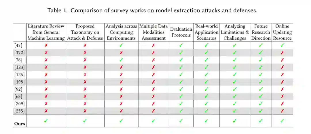 提出全面的模型提取分类法:我们提出了一种新颖而全面的分类框架,从攻击机制、防御策略和计算环境三个维度系统性地对 MEAs 进行分类。 * 系统性回顾现有技术:我们对现有的模型提取攻击与防御技术进行系统性回顾,深入分析其方法、优缺点及适用条件。 * 多维度评估与未来展望:我们从技术、伦理、法律和社会等多个维度评估 MEAs 的影响,并指出关键研究挑战与未来有前景的方向。 * 持续更新的在线资源库:我们维护一个开源仓库,持续收集相关论文与资源,包括论文链接、代码库、基准测试与性能比较。