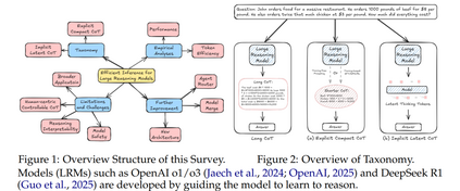 大规模推理模型(LRMs)通过学习推理显著提高了大语言模型(LLMs)的推理能力,在复杂任务求解中展现出有前景的表现。然而,它们的深思熟虑推理过程导致了令牌使用、内存消耗和推理时间上的低效。因此,本综述回顾了专门为 LRMs 设计的高效推理方法,重点解决在保持推理质量的同时减少令牌低效的问题。本文的概述结构如图 1 所示。首先,我们介绍了一种分类法,将近期的方法分为两大类:(a)显式紧凑的思维链(CoT),该方法在保持显式推理结构的同时减少令牌数量;(b)隐式潜在的思维链(CoT),该方法将推理步骤编码在隐含表示中,而不是显式令牌中。与此同时,我们讨论了它们的优缺点。接着,我们从性能和效率两个方面对现有方法进行了实证分析。此外,我们还提出了该领域中的开放挑战,包括以人为本的可控推理、推理的可解释性与效率之间的权衡、确保高效推理的安全性,以及高效推理的更广泛应用。此外,我们强调了通过模型合并、新架构和代理路由器等技术提升 LRM 推理效率的关键见解。我们希望这项工作能为研究人员提供有价值的指导,帮助他们克服这一充满活力领域中的挑战。