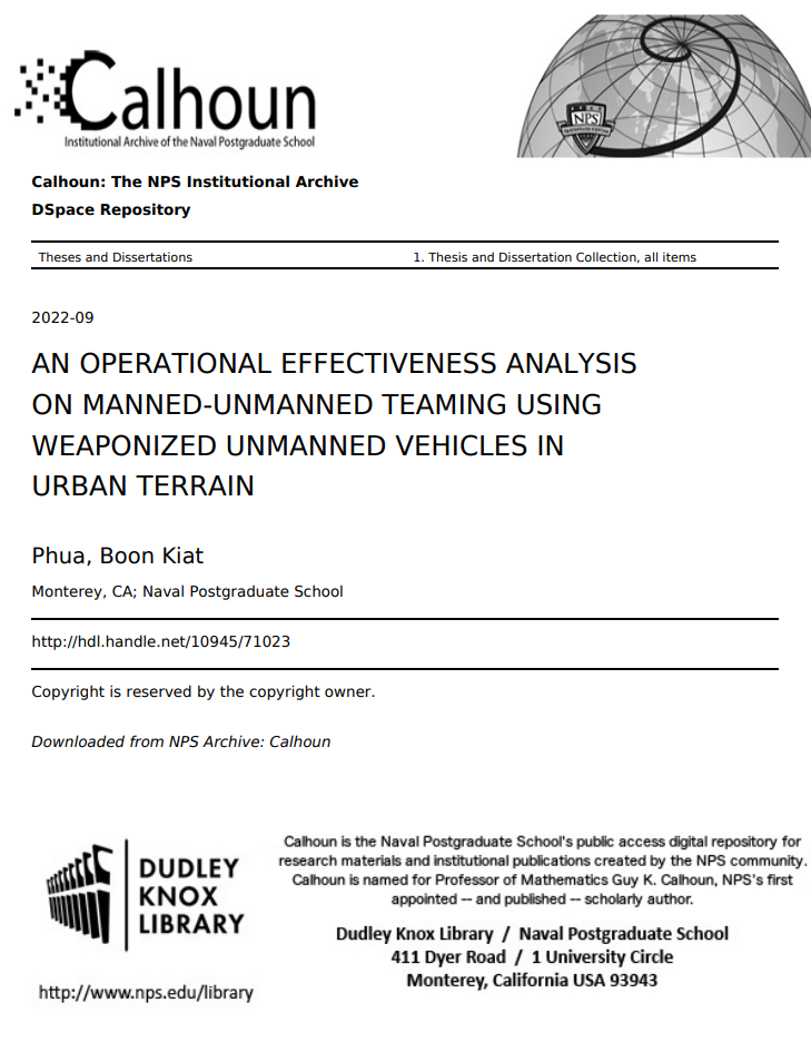 本论文使用基于智能体的模拟环境 "地图感知非统一自动机"(MANA),通过建立一个模拟并对UGV的作战方案进行分析,再加上影响城市地形中进攻性步兵部队作战效率的因素,来研究MUM-T。