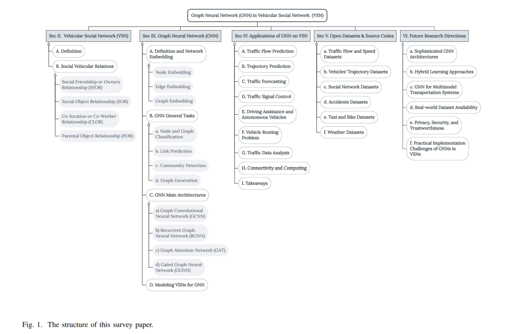 摘要——图神经网络(Graph Neural Networks, GNNs)近年来已成为建模复杂互联数据的强大工具,使其特别适用于广泛的智能交通系统(Intelligent Transportation System, ITS)应用。本综述首次系统性地针对车载社交网络(Vehicular Social Networks, VSNs)中的 GNN 应用展开全面回顾。通过利用包括交通模式、道路使用者以及天气条件在内的欧氏与非欧氏交通相关数据,GNN 为分析与提升 VSN 应用提供了有前景的解决方案。