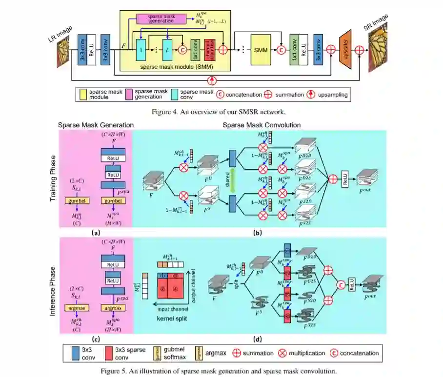 为解决上述问题,我们对图像超分中的稀疏性问题进行了探索,并用于改善超分网络的推理高效性。具体来说,我们设计了一种Sparse Mask SR(SMSR)学习稀疏掩码以剪枝冗余计算量。结合所提SMSR,空域掩码学习判别“重要性”区域而通道掩码学习冗余通道(即不重要区域)。因此,冗余计算空域被精确的定位并跳过,同时保持同等性能。