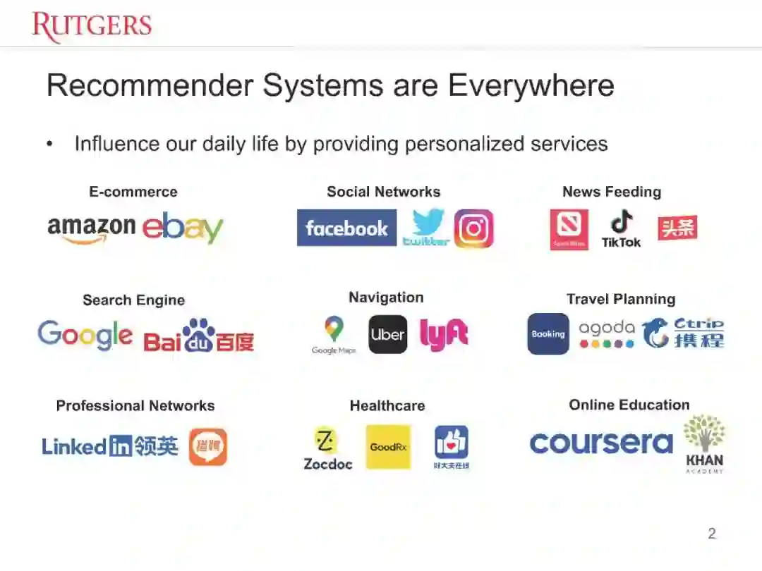 推荐系统被认为是缓解信息过载的最有效工具之一,已被广泛部署在许多现实世界的系统中,如电子商务平台(如亚马逊、eBay)、社交网络(如Facebook、Twitter)、视频分享平台(如Youtube、TikTok)和流媒体服务(如Netflix、Hulu)。一般来说,这些系统使用高级技术从历史数据以及收集的用户、物品和内容信息中了解用户的偏好。近年来,这些技术的发展迅速。