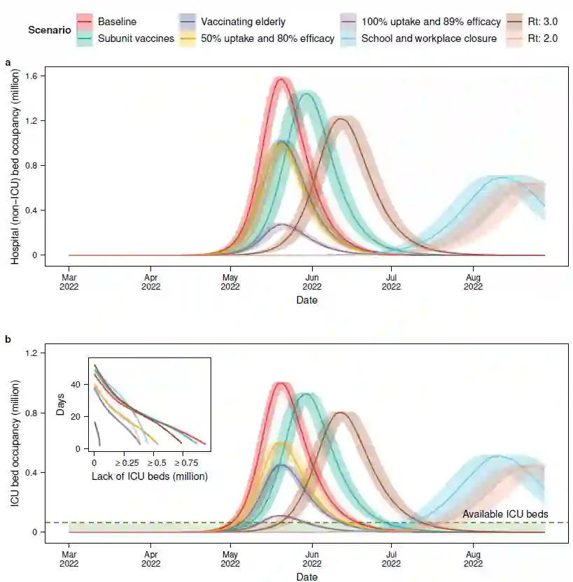 2022 年 3 月至 2022 年 9 月在乐观的 VE 情景下,中国采用个体缓解策略时预计的病床和 ICU 需求和短缺(图源自Nature Medicine )自 2021 年 8 月以来,**中国为应对具有较高传播能力的 SARS-CoV-2 变种而采取的这一政策包括一套全面的措施,以识别 SARS-CoV-2 感染并阻止任何传播链,从而反复将本地传播归零。**截至2022年5月,两种获批的抗病毒治疗药物(BRII-196/BRII-198联合用药和nirmatrelvir/ritonavir联合包)已在中国使用,为抗击COVID-19提供了新工具。该研究开发了一个针对 2022 年上海 Omicron 爆发的初始增长阶段校准的 SARS-CoV-2 传播的年龄结构随机区室易感-潜伏-感染-去除-易感 (SLIRS) 模型,以预测 COVID- 19 假设缓解情景下的负担(即病例数、需要住院和重症监护的患者以及死亡人数)。**该模型还考虑了特定年龄的疫苗覆盖率数据、针对不同临床终点的疫苗功效、免疫力减弱、不同的抗病毒疗法和非药物干预。**该研究发现,**2022 年 3 月的疫苗接种活动诱导的免疫水平不足以防控 Omicron 浪潮,这将导致重症监护能力超出预期,重症监护病房的峰值需求预计是现有能力的 15.6 倍,并导致约 155 万人死亡。**然而,该研究还估计,**通过确保疫苗和抗病毒疗法的可及性以及维持非药物干预措施的实施来保护弱势个体可能足以防止医疗保健系统不堪重负,这表明这些因素应成为未来缓解政策的重点。