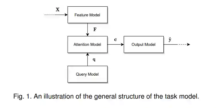 本节介绍一种注意力一般性与相应的符号。这里介绍的符号是基于[23]中引入并在[13]中普及的符号。本节中介绍的框架将在本文的其余部分中使用。为了实现一个通用的注意力模型,首先需要描述一个可以使用注意力的模型的一般特征。首先,我们将完整的模型称为任务模型,其结构如图1所示。这个模型只接受一个输入,执行指定的任务,并产生所需的输出。例如,任务模型可以是一种语言模型,它将一段文本作为输入,并将内容摘要、情绪分类或逐字翻译成另一种语言的文本作为输出。或者,任务模型可以获取图像,并为该图像生成标题或分割。任务模型由四个子模型组成: 特征模型、查询模型、注意力模型和输出模型。在2.1小节中,我们讨论了特征模型和查询模型,它们是用来为注意力计算准备输入的。在2.2小节中,我们讨论了注意力模型和输出模型,它们与产生输出有关。