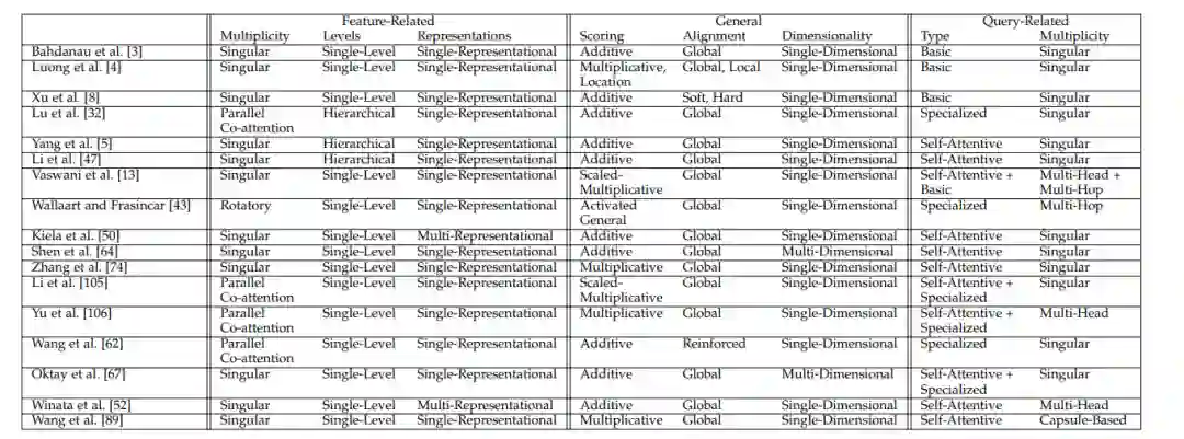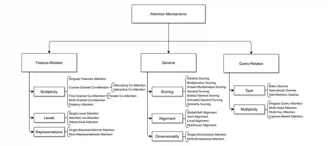 **基于特定的一组输入数据,特征模型提取特征向量,从而使注意力模型能够关注这些不同的向量。这些特征可能具有特定的结构,需要特殊的注意力机制来处理它们。可以对这些机制进行分类,以处理以下特征特征之一: 特征的多样性、特征的级别或特征的表示。