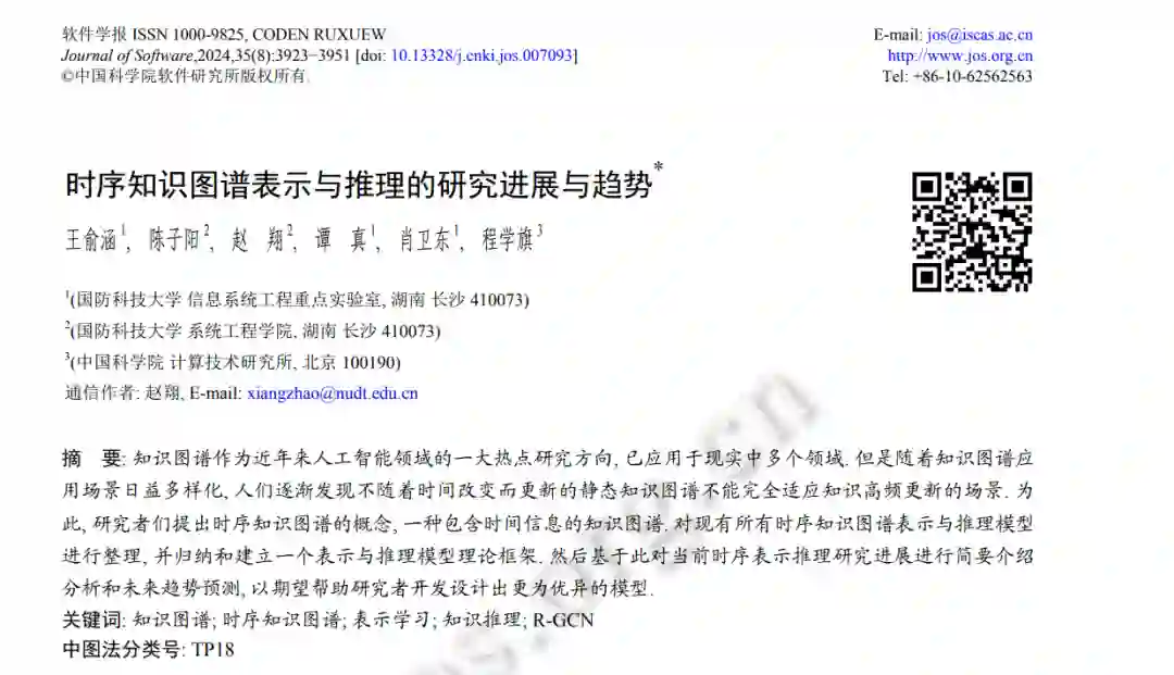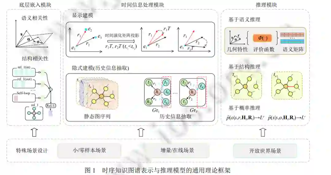 知识图谱作为近年来人工智能领域的一大热点研究方向, 已应用于现实中多个领域. 但是随着知识图谱应 用场景日益多样化, 人们逐渐发现不随着时间改变而更新的静态知识图谱不能完全适应知识高频更新的场景. 为 此, 研究者们提出时序知识图谱的概念, 一种包含时间信息的知识图谱. 对现有所有时序知识图谱表示与推理模型 进行整理, 并归纳和建立一个表示与推理模型理论框架. 然后基于此对当前时序表示推理研究进展进行简要介绍 分析和未来趋势预测, 以期望帮助研究者开发设计出更为优异的模型.知识图谱的概念自 2012 年正式提出之后, 相关研究迅速成为热点研究, 并且通过几年发展, 知识图谱成为继 自然语言处理之后人工智能领域的又一新兴研究方向[1,2] . 最初的知识图谱是 Google 为了改善搜索引擎, 提高搜索效率而提出的, 主要服务于搜索引擎中的智能问答. 但是随着多年的技术创新和应用场景的扩展, 知识图谱逐渐 成为一种可以支撑多种领域应用、高效储存信息的数据形式. 知识图谱的规模越来越大, 能储存的知识越来越广 泛, 逐步出现了各种领域知识图谱, 诸如: 通用知识图谱、医疗知识图谱、政务知识图谱等. 为更多的人工智能应 用提供底层数据服务, 如: 推荐系统[3]、智能问答[4]等. 随着知识图谱逐步成为一个全新的研究方向, 针对其研究的划分越来越清晰, 研究内容越来越全面, 包含了知 识抽取、图谱构建、知识表示、知识融合、知识推理、图谱补全、质量评估等[5,6] . 但是, 随着知识图谱的应用越 来越广泛, 传统的静态知识图谱已经不能满足人们的需求[7] , 缺少的动态变化是限制其的重要因素之一, 因此, 时 序知识图谱的概念和相关研究就应运而生[8] , 逐渐成为学界研究的热点. 而以时序知识图谱为核心的相关研究与 应用受到工业界和学术界的广泛关注[9] . 时序知识图谱在 2016 年才被提出[9] , 相关研究还不足 10 年, 但是其与知识图谱紧密相关, 所以在研究初期就 参考知识图谱有了详细的细分方向研究, 如: 时序知识抽取[10]、时序知识表示、时序知识推理等[1,9] . 其中, 时序知 识表示和推理是最为核心和关键的研究方向, 也是发展至今研究进度最快的方向, 有较多的研究成果产出. 时序知 识表示和推理, 在整个时序知识图谱研究中是最为重要的, 是一切其他研究的基础, 表示推理效果好坏在很大程度 上决定其他方向的研究和时序图谱的应用效果. 因此, 本文针对现有的时序知识图谱表示与推理的研究进展和未 来趋势进行介绍和分析, 以期望为后来的研究者提供参考, 帮助新关注此领域的研究者们更快地了解当前时序知 识图谱的研究动态. 同时, 本文根据现有的所有表示推理模型, 归纳构建了一个时序知识图谱表示与推理模型理论框架, 并以此来 介绍对比现有模型, 帮助后来的研究者更好地开发设计新的、更优秀的表示推理模型. 最后, 本文也结合当前的发展现状, 与实际面临的问题挑战, 提出了几个未来较为可行的时序图谱表示推理研 究方向, 以期望为研究者提供一些灵感.