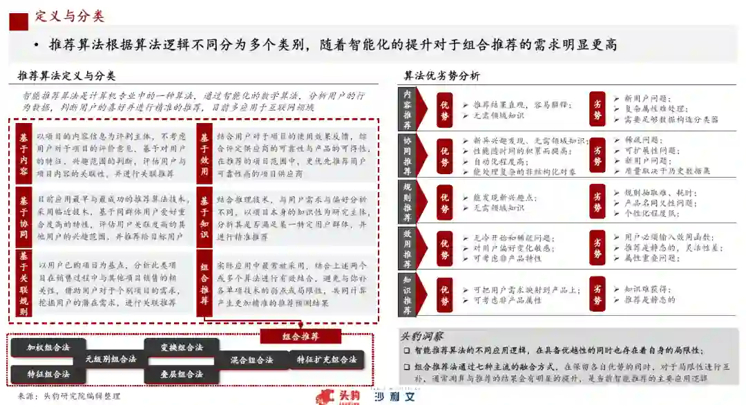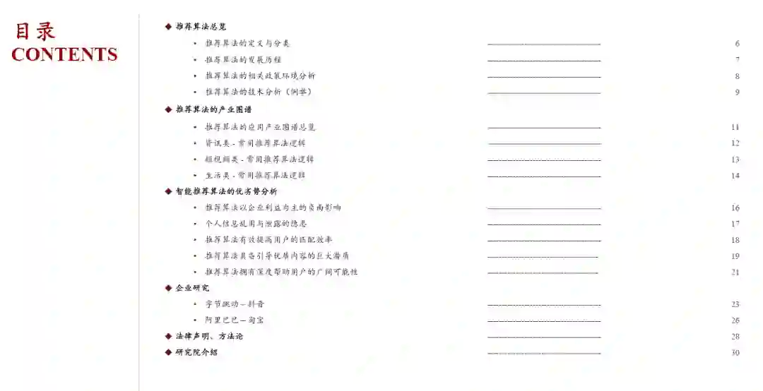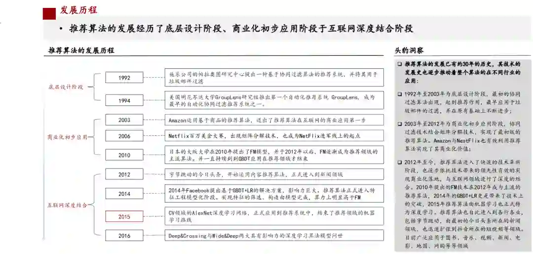 2012年至今,推荐算法进入了快速的技木革新阶段,也逐步依托技木带来的领先性有效的实现商业化落地,与互联网领域进行了深度的结合。2010年提出的FM技术在2012年成为主流的推荐算法,2014年的GBDT+LR更是带来了技木上的突破,2015年推荐算法由机器学习也正式转为深度学习。推荐算法也自此进入到各行各业,目前广泛应用于图书、音乐、视频、新闻、电影、地图、网购等等领域: 推荐算法与不同领域触合时,考虑到场景的运行逻辑不同也会采用不同的运行机制,以适应场景的特殊性 推荐算法是通过合理的逻辑运算,为用户推荐最适合的内容,在馍型角度上讲,是拟合用户对于内容满意程度的预测函数。新闻资讯领域的推荐算法着重考虑三方面因素,对应模型中的三大要素,第一要素为内容,第二要素为用户特征、第三要素为环境特征:以抖音为代表的短视频领域,多以内容发布为起点,通过智能算法匹配到合适的用户,再根据反绩决定是否扩大内容的传播范围:生活类更多围绕用户的兴趣标签,以及用户的历史搜索标签进行关联推荐与深入推荐: 平台与机构运用推荐算法,商业运行效率提高、用户快速获取所需、内容与产品供应商实现高效供应 推荐算法作为桥梁快速匹配用户与内容或产品,提高整个链条的运行效率:用户角度,效率明显提高,算法通过分析精准推荐用户感兴趣的内容或产品,省去了搜索与查找得时间,快速定位到用户需要:内容产出者与商家角度,对于内容或产品对于目标用户/客户群体的精准投放得以快速实现,加快了匹配效率,使得内容与产品可以快速传播。 推荐算法不仅要广泛应用,更需要广泛善用 推荐算法的应用已经涉及到国民生活的方方面面,确实为广大用户与内容或产品供应方提供了巨大的便利,但随着应用推荐算法的机构与平台影响力逐步扩大,对于算法的善用成为更值得探讨的话题; 推荐算法应用伴生的个人信息安全问赵、个人隐私泄露问题、泛媒乐化趋势、内容传播低屑化趋势等,结合各类平台与机构的海量流量,影响范围巨大。平台与机构在获得大量收益的同时,是否也需要采取措施,肩负起一定的社会责任,由重视企业利益,转变为用户利益为主,在社会或是国家层面起到更加积极的作用。
