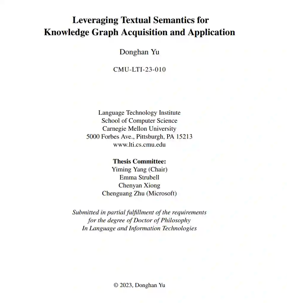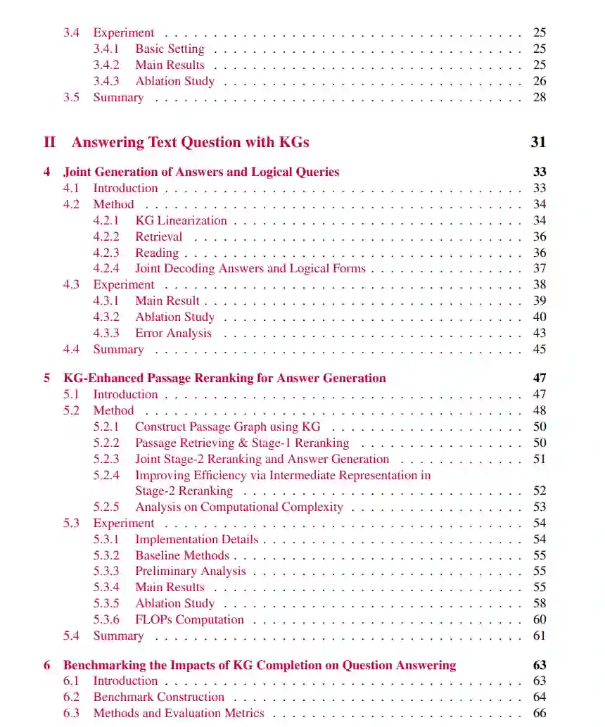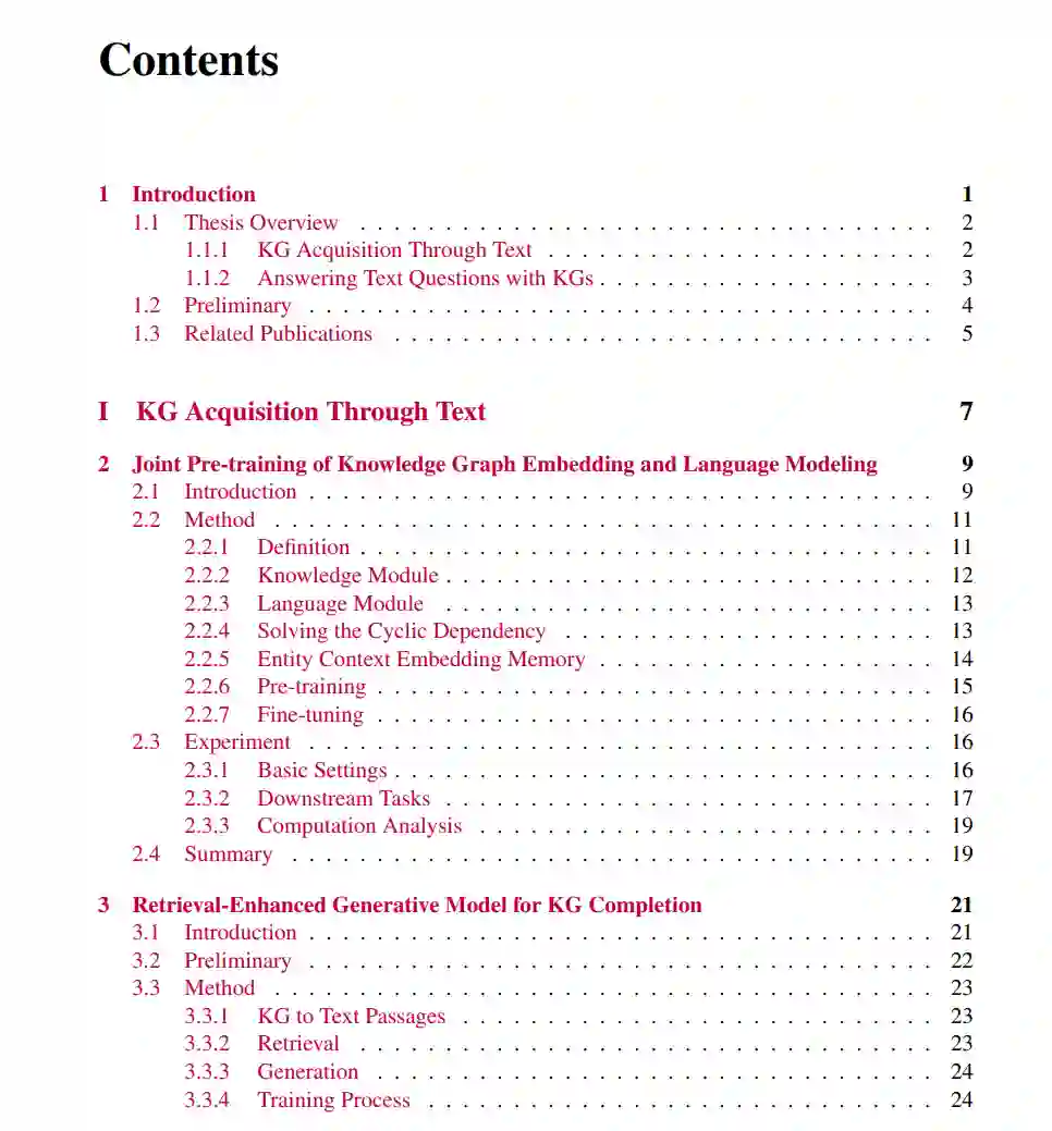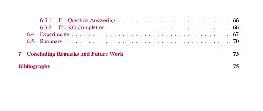此目标分为两个互补的部分:提高KGs的质量以及利用KGs解决用户查询。 在第一部分,我们专注于通过文本获取KGs。我们从一个同时学习KGs和文本的向量表示的预训练框架开始。它具有相互增强的KG-文本双模块,实现了在关系提取和实体分类上的强大结果(第2章)。为了解决大型KGs的可扩展性挑战,我们提出了一个增强检索的文本生成模型,用于KG的完成。它利用KGs中语义相关的三元组来指导缺失实体的生成,展现了最先进的性能,同时保持了低内存使用(第3章)。 在第二部分,我们将注意力转向利用KGs进行关键的问答(QA)任务。在答案来源于KGs的设定中,我们提出了一个框架,该框架同时生成逻辑查询和文本答案,以产生更准确和稳健的结果(第4章)。然后我们扩展到答案主要来自文本语料库而不是KGs的场景。我们提出的方法利用KGs构建文本段落之间的链接。这种结构信息被利用来重新排列并修剪每个问题的相关段落,显著降低了计算成本(第5章)。最后,我们处理不完整的KGs的设定。我们介绍了第一个基准数据集,用于评估KG完成方法对问题回答的影响。我们的实验强调了共同研究KGs的获取和应用的必要性(第6章)。 真实世界中的对象并不是孤立存在的;它们之间存在语义联系。例如,一种药物可以与疾病相关,作为其治疗方法,而一家公司可以与一个电子游戏相关,作为其开发者。知识图谱(KGs)捕获了这些联系,并将它们表示为图结构。在KGs中,对象被称为实体(节点),而它们之间的连接被称为关系(边)。KG内的基本单元被称为三元组,由三个元素组成:头实体、关系和尾实体,例如(Elden Ring,由...开发,FromSoftware),这表达了电子游戏Elden Ring是由游戏公司FromSoftware开发的。KGs的图结构允许它们展示真实世界对象之间的各种连接,并促进复杂的查询和分析。此外,KGs专注于捕获重要对象上的关键连接,并消除不正确或不相关的细节。鉴于这些好处,KGs已被应用于各种真实世界的场景,如问题回答[118]、信息检索[64]和推荐系统[104],并且在财务[26]、营销[27]、医学[82]等不同领域中实施。 KGs的重要性在机器学习领域引起了广泛的关注。许多研究主要集中在KGs的结构上,同时将实体或关系仅表示为索引,从而忽略了它们的文本信息。例如,实体Elden Ring只是被表示为一个随机的唯一索引,如1203,没有语义意义,忽略了其文本名称“Elden Ring”和描述“Elden Ring是2022年由FromSoftware开发的动作角色扮演游戏...”。这既妨碍了KGs的获取,也妨碍了其应用。例如,考虑从文本声明中提取三元组的过程。当遇到像“FromSoftware因开发电子游戏Elden Ring而获得广泛认可”这样的陈述时,添加或验证文本丰富的三元组(“Elden Ring”,“由...开发”,“FromSoftware”)要比纯粹基于索引的三元组(1203,47,1580)容易得多。同样,当应用KGs来帮助用户的文本查询,如“我可以在PS5上玩Elden Ring吗?”时,拥有文本丰富的三元组(“Elden Ring”,“平台”,“PlayStation 5”)便于生成准确的答案。如果没有这样的文本信息,将文本句子或用户查询与纯实体和关系索引对齐可能会成为一个复杂的障碍。这些示例强调了KGs中文本信息的基本作用。它不仅简化了关系数据的获取,而且还增强了KGs在真实世界应用中的功能。