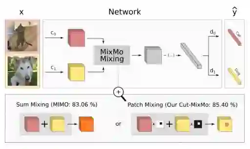 在本文,作者提出了多输入多输出框架MixMo。为了解决传统集成中出现的这些开销,作者将M个独立子网放入一个单一的base网络中。这也是合理的,因为在模型集成时,“最终采纳的网络”其实就和整体的网络表现差不多。