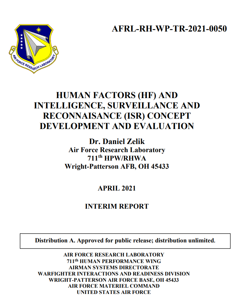 北大西洋公约组织(NATO)研究与技术组织(RTO)人为因素与医学(HFM)小组任务组(研究与技术组(RTG)-276 NATO RTG HFM-276)"人为因素与 ISR 概念开发与评估 "的成立是为了确定和了解对有效的 ISR 行动至关重要的HF问题。更确切地说,这项开创性工作的目标是 (1) 确定对有效的 ISR 行动至关重要的HF问题(如态势感知 (SA)、工作量、组织结构、协调和协调机制、可视化、信任、信息共享和管理、领导力和决策);(2) 使用行为理论模型来制定我们的研究方法并理解我们的研究结果;(3) 就在 ISR CD&E 行动中使用和实施HF研究提出建议。