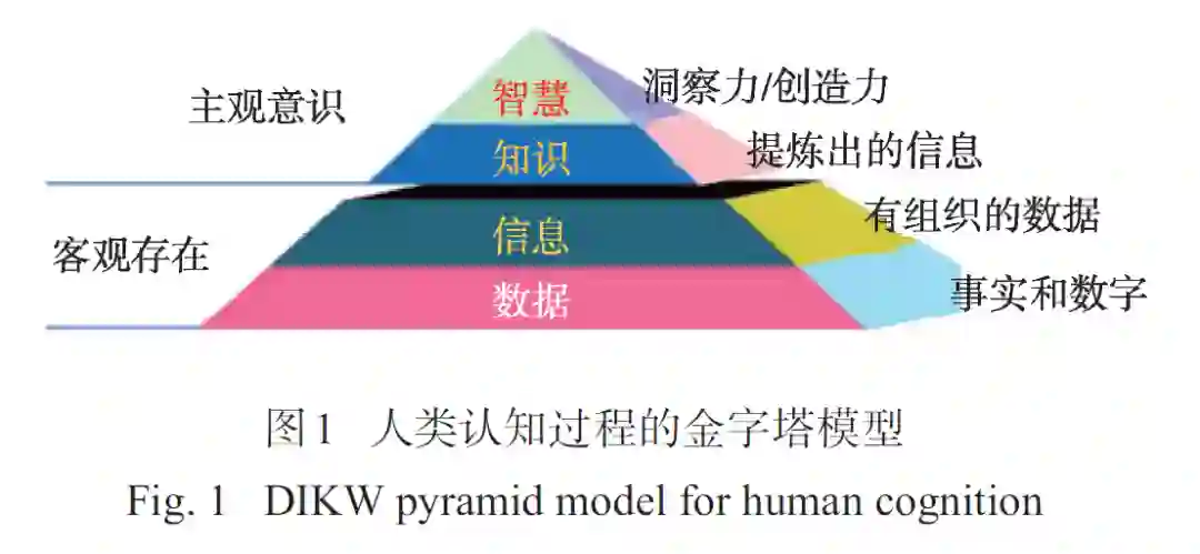 知识这一概念源于人类不断递进的认知过程,一般遵从数据(Data)-信息(Information)- 知识(Knowledge)-智慧(Wisdom)的金字塔模型(DIKW)①(①https://baike.baidu.com/item/DIKW模型/50904093。),如图1所示。数据是使用约定俗成的关键词,对客观事物数量、属性、位置及相互关系的抽象表示。信息是指具有时效性、有一定含义,有逻辑、经过加工处理、对决策有价值的数据流。知识是不断凝练并与已有知识库进行结构化整合的有价值的信息。智慧是基于已有知识,针对客观世界运动过程中产生的问题,根据获得的信息进行分析、对比、演绎,进而找出解决方案的能力。