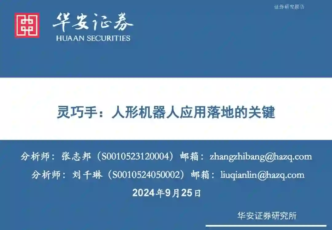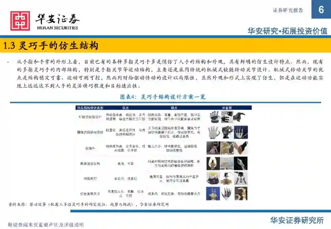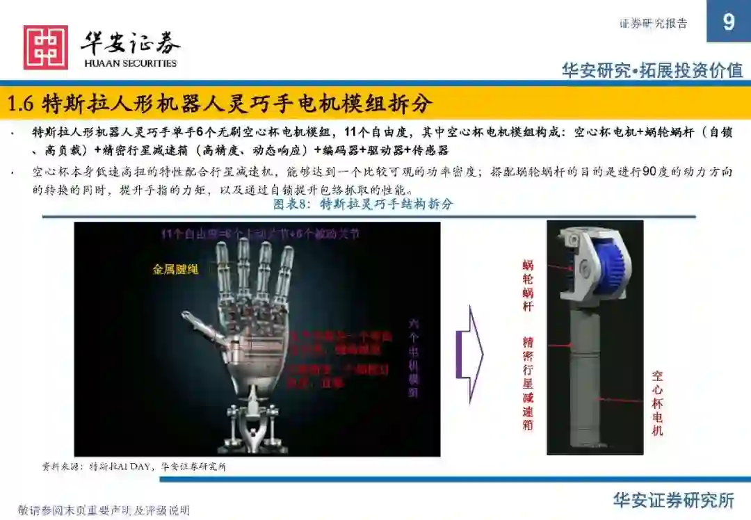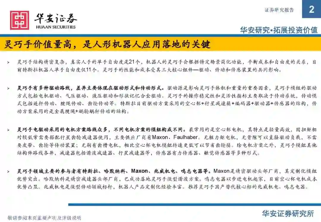灵巧手有多种驱动路线,差异主要体现在驱动形式和传动形式。驱动源是影响灵巧手体积和重量的重要因素,灵巧手模组的驱动方式包括电机驱动、气压驱动、液压驱动和形状记忆合金驱动。灵巧手的操作稳定性和灵活性指标主要取决于传动系统,传动模式包括连杆传动、腱绳传动、齿轮传动等。特斯拉目前驱动方案采用的空心杯+行星减速箱+编码器+驱动器+传感器的结构,传动方案采用的是金属腱绳+蜗轮蜗杆传动的结构。 灵巧手电驱动采用的电机方案路线众多,不同电机方案的模组构成不同。最常用的是空心杯电机,其特点是轻量高效,因扭矩相对较低常需要搭配行星齿轮减速器使用,主要供应厂商有Maxon、Faulhaber。无框力矩电机,无背隙可以直接驱动负载,不需要皮带、齿轮等传动装置;无刷有齿槽电机,相比空心杯电机模组转速更低可以节省齿轮箱。除电机方案之外,灵巧手模组其他结构件路线各异,减速器包括谐波减速器、行星减速器等,传感器有力传感器、触觉传感器等多种形式。 灵巧手领域主要的参与者有特斯拉、哈默纳科、Maxon、兆威机电、鸣志电器等。Maxon是精密驱动头部厂商,其定制化模组优势突出。哈默纳科是精密减速器头部厂商,已成功落地灵巧手微型谐波方案。鸣志电器以步进电机起家,目前空心杯电机成本优势凸显。兆威机电是微型传动领域标杆,机器人产品定制化经验丰富。推荐灵巧手国产替代核心标的兆威机电、鸣志电器。