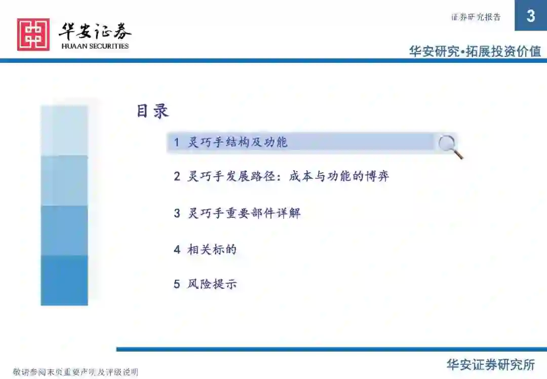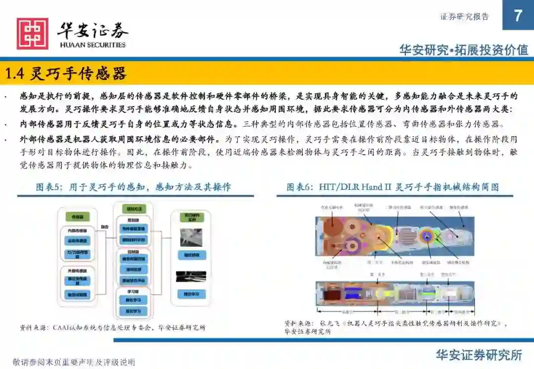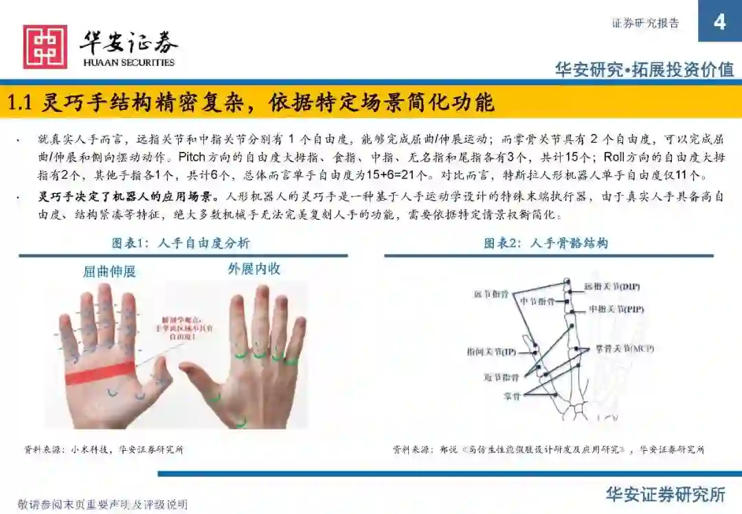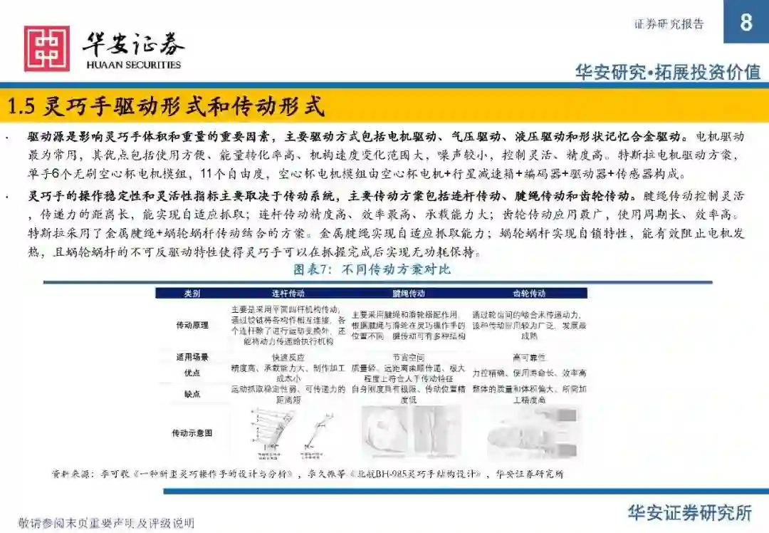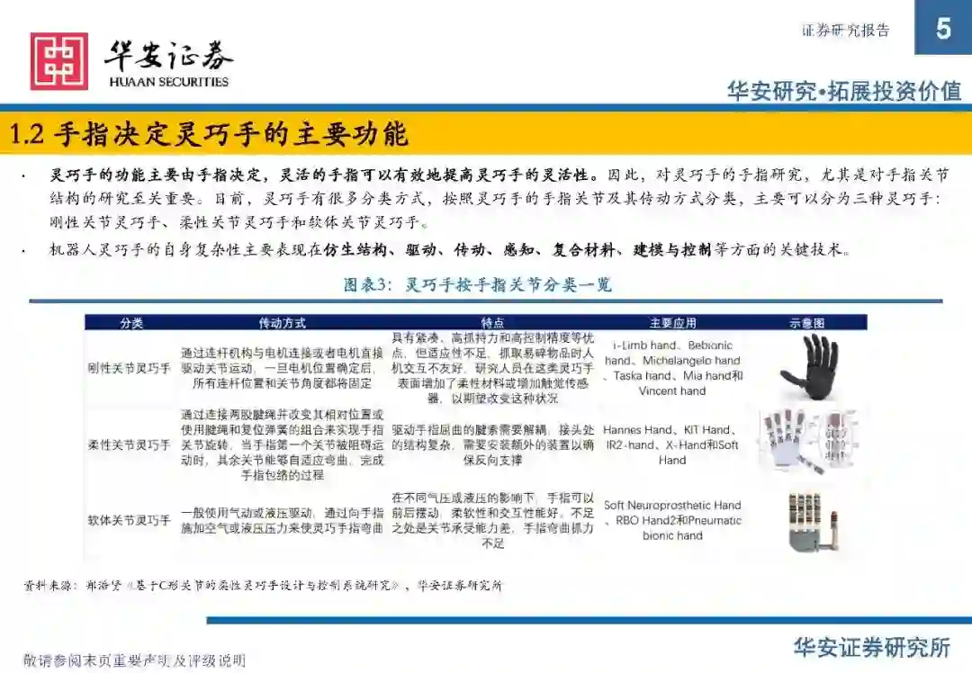 灵巧手结构精密复杂,真实人手的单手自由度是21个,机器人的灵巧手会根据特定场景简化功能,平衡成本和自由度的关系,目前特斯拉机器人单手自由度仅11个。灵巧手的性能和成本受其三大核心组件—驱动、传动和传感装置的共同影响。