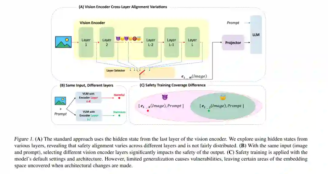 视觉语言模型(VLMs)在多模态任务中取得了显著进展,但它们更复杂的架构使得其安全性对齐比大型语言模型(LLMs)更具挑战性。在本文中,我们揭示了VLM视觉编码器各层之间安全性分布的不公平性,发现较早和中间层相较于更强健的最终层,对恶意输入的脆弱性较大。这种“跨层”脆弱性源于模型未能将其安全性训练从训练时使用的默认架构设置泛化到未见或分布外的场景,导致某些层暴露在外。我们通过投影来自不同中间层的激活进行全面分析,并证明这些层在暴露于恶意输入时更可能生成有害的输出。我们对LLaVA-1.5和Llama 3.2的实验显示,攻击成功率和毒性评分在各层之间存在差异,表明当前仅针对单一默认层的安全对齐策略是不足够的。